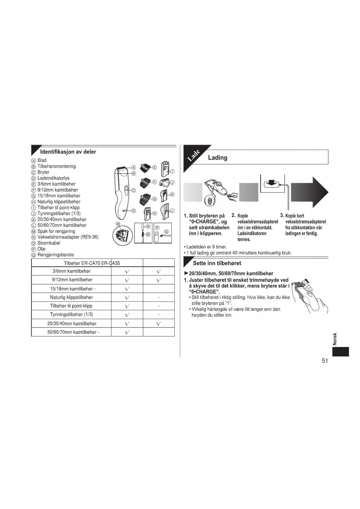 Ikke bruk noen annen strømkabel eller vekselstrømsadapter enn det som er spesielt laget for denne modellen. (RE9‑36) Bruks- og lagringsvarsel Ikke demonter eller modiser klipperen. Ikke prøv å reparere den. Reparasjoner må alltid henvendes til forhandleren. Dette apparatet er ikke beregnet for bruk av personer (inklusive barn) med reduserte fysiske, følelsesmessige eller mentale anlegg, eller med manglende erfaring og kunnskap, dersom de ikke får tilsyn eller veiledning angående bruk av apparatet av en person som er ansvarlig for deres sikkerhet. Barn bør ha tilsyn for å sikre at de ikke leker med apparatet. Denne klipperen er kun til innendørs bruk. Ikke lagre klipperen på et sted som er utsatt for direkte sollys eller nær varmeapparat eller annen varmekilde. Spesikasjoner Strømkilde: Se navneplaten på produktet. (Automatisk spenningsomformer) Motorspenning: 1,2 V DC Ladetid: 8 timer Luftbåren akustisk støy: 55 (dB (A) re 1 pW)