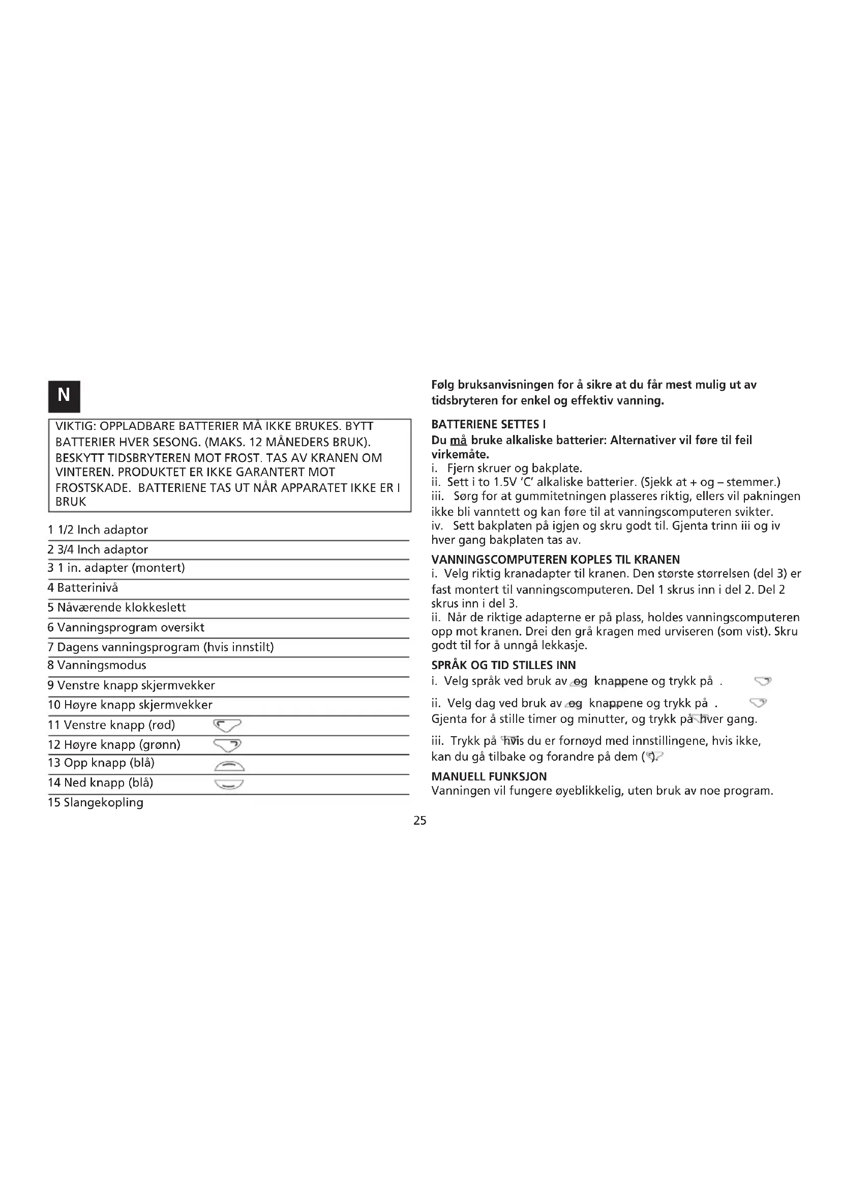 Trykk på når MENU blir vist, og bruk for å gå inn på hovedmenyen for ytterligere særtrekk. SETTINGS LANGUAGE – Velg språket du vil ha ved å bruke knappene. Trykk på for å stille inn språket og vise hovedmenyen. SET DAY AND TIME – Velg verdiene for dag, time og minutter på klokka med knappene. Trykk på for å stille inn nye verdier og vise hovedmenyen. MISER % - stiller inn hvor mye vanningstidene reduseres når tidsbryteren er i Miser modus. Lavere % gir kortere vanning. Trykk på for å stille inn nye verdier og gå tilbake til Settings menyen. TURBO % - stiller inn hvor mye vanningstidene forlenges når tidsbryteren er i Turbo modus. Høyere % gir lengre vanning. Trykk på for å stille inn nye verdier og gå tilbake til Settings menyen. CONFIRMATIONS? – Still på ON for å vise YES / NO bekreftelse på skjermen når programverdier skal forandres, f. eks. etter å ha valgt forhåndsinnstilt vanning. Trykk på for å stille inn ny verdi og gå tilbake til Settings menyen. MANUAL ON TIME – Velg normalverdien for manuell vanning. Trykk på for å stille inn nye verdier og gå tilbake til Settings menyen. RESTORE FACTORY DEFAULTS – Ved å trykke på vil alle originalinnstillingene lastes på nytt, deretter vises hovedmenyen. PAUSE WATERING Denne opsjonen på vanningsmenyen stopper den programmerte vanningen, både nå og senere. Trykk på knappen for å begynne vanning igjen.