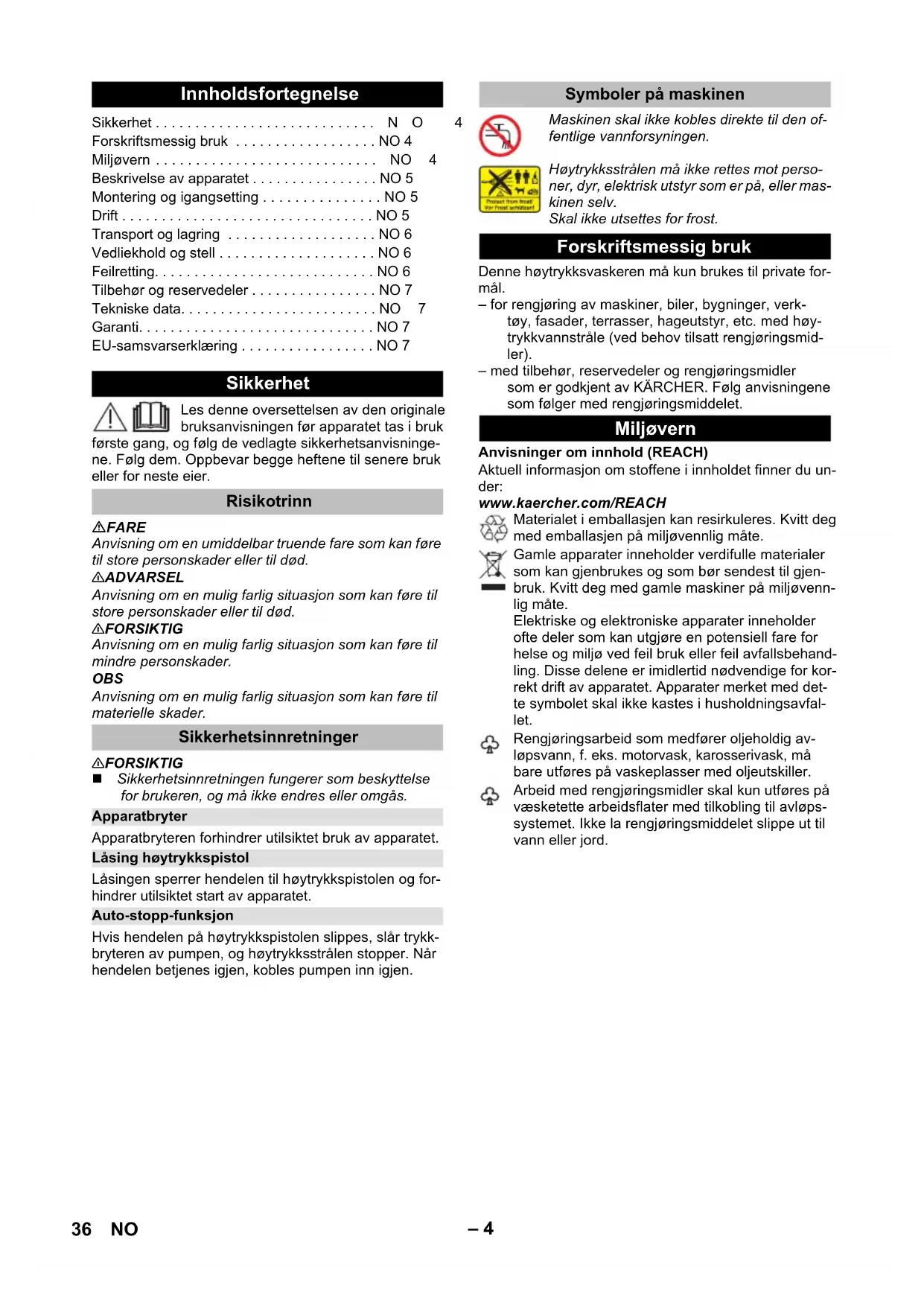 90 dB(A) Der tages forbehold for tekniske ændringer. Garanti EU-overensstemmelseserklæring Produkt: Højtryksrenser Type: 1.673-xxx Gældende EU-direktiver 2000/14/EF 2014/30/EU 2006/42/EF (+2009/127/EF) 2011/65/EU Anvendte harmoniserede standarder EN 50581 EN 55014–1: 2006+A1: 2009+A2: 2011 EN 55014–2: 2015 EN 60335–1 EN 60335–2–79 EN 61000–3–2: 2014 EN 61000–3–3: 2013 EN 62233: 2008 Anvendte overensstemmelsesvurderingsprocedu- rer 2000/14/EF: Bilag V Lydeffektniveau dB(A) Målt: 88 Garanteret: 90 Winnenden, 2016/08/01 CEO Head of Approbation 35DA– 4 Les denne oversettelsen av den originale bruksanvisningen før apparatet tas i bruk første gang, og følg de vedlagte sikkerhetsanvisninge- ne. Følg dem. Oppbevar begge heftene til senere bruk eller for neste eier. FARE Anvisning om en umiddelbar truende fare som kan føre til store personskader eller til død. 몇 ADVARSEL Anvisning om en mulig farlig situasjon som kan føre til store personskader eller til død. 몇 FORSIKTIG Anvisning om en mulig farlig situasjon som kan føre til mindre personskader. OBS Anvisning om en mulig farlig situasjon som kan føre til materielle skader. 몇 FORSIKTIG Sikkerhetsinnretningen fungerer som beskyttelse for brukeren, og må ikke endres eller omgås. Apparatbryteren forhindrer utilsiktet bruk av apparatet. Låsingen sperrer hendelen til høytrykkspistolen og for- hindrer utilsiktet start av apparatet. Hvis hendelen på høytrykkspistolen slippes, slår trykk- bryteren av pumpen, og høytrykksstrålen stopper. Når hendelen betjenes igjen, kobles pumpen inn igjen. Denne høytrykksvaskeren må kun brukes til private for- mål. – for rengjøring av maskiner, biler, bygninger, verk- tøy, fasader, terrasser, hageutstyr, etc. med høy- trykkvannstråle (ved behov tilsatt rengjøringsmid- ler). – med tilbehør, reservedeler og rengjøringsmidler som er godkjent av KÄRCHER. Følg anvisningene som følger med rengjøringsmiddelet. Anvisninger om innhold (REACH) Aktuell informasjon om stoffene i innholdet finner du un- der: www.kaercher.com/REACH Innholdsfortegnelse Sikkerhet . . . . . . . . . . . . . . . . . . . . . . . . . . . .NO 4 Forskriftsmessig bruk . . . . . . . . . . . . . . . . . . NO 4 Miljøvern . . . . . . . . . . . . . . . . . . . . . . . . . . . . NO 4 Beskrivelse av apparatet . . . . . . . . . . . . . . . . NO 5 Montering og igangsetting . . . . . . . . . . . . . . . NO 5 Drift . . . . . . . . . . . . . . . . . . . . . . . . . . . . . . . . NO 5 Transport og lagring . . . . . . . . . . . . . . . . . . . NO 6 Vedliekhold og stell . . . . . . . . . . . . . . . . . . . . NO 6 Feilretting. . . . . . . . . . . . . . . . . . . . . . . . . . . . NO 6 Tilbehør og reservedeler . . . . . . . . . . . . . . . . NO 7 Tekniske data. . . . . . . . . . . . . . . . . . . . . . . . . NO7 Garanti. . . . . . . . . . . . . . . . . . . . . . . . . . . . . . NO 7 EU-samsvarserklæring . . . . . . . . . . . . . . . . . NO 7 Sikkerhet Risikotrinn Sikkerhetsinnretninger Apparatbryter Låsing høytrykkspistol Auto-stopp-funksjon Symboler på maskinen Maskinen skal ikke kobles direkte til den of- fentlige vannforsyningen. Høytrykksstrålen må ikke rettes mot perso- ner, dyr, elektrisk utstyr som er på, eller mas- kinen selv. Skal ikke utsettes for frost. Forskriftsmessig bruk Miljøvern Materialet i emballasjen kan resirkuleres. Kvitt deg med emballasjen på miljøvennlig måte. Gamle apparater inneholder verdifulle materialer som kan gjenbrukes og som bør sendest til gjen- bruk. Kvitt deg med gamle maskiner på miljøvenn- lig måte. Elektriske og elektroniske apparater inneholder ofte deler som kan utgjøre en potensiell fare for helse og miljø ved feil bruk eller feil avfallsbehand- ling. Disse delene er imidlertid nødvendige for kor- rekt drift av apparatet. Apparater merket med det- te symbolet skal ikke kastes i husholdningsavfal- let. Rengjøringsarbeid som medfører oljeholdig av- løpsvann, f. eks. motorvask, karosserivask, må bare utføres på vaskeplasser med oljeutskiller. Arbeid med rengjøringsmidler skal kun utføres på væsketette arbeidsflater med tilkobling til avløps- systemet. Ikke la rengjøringsmiddelet slippe ut til vann eller jord. 36 NO– 5 Leveringsomfanget til apparatet (avhengig av modell) er vist på emballasjen. Denne bruksanvisningen beskriver alle mulige opsjoner. Figurer se grafikk-sider 1 Høytrykksforsyning 2 Apparatbryter "0/OFF" / "I/ON" 3 Oppbevaringskrok 4 Bærehåndtak 5 Transportgrep, uttrekkbar 6 Oppbevaring for strålerør 7 Oppbevaring for høytrykkspistol 8 Vanntilkobling med innebygget sil 9 Koblingsdel for vanntilkoblingen 10 Strømledning med støpsel 11 Transporthjul 12 Høytrykkspistol 13 Låsing høytrykkspistol 14 Klammer for høytrykksslange 15 Høytrykksslange 16 Full Control strålerør smussfres For hardnakket smuss Trykktrinn: HARD 17 Full Control strålerør Click-Vario Power For enkle rengjøringsoppgaver Trykktrinn: HARD / MEDIUM / SOFT / MIX Figurer se grafikk-sider Illustrasjoner - De løse delene som følger apparatet skal monteres før det tas i bruk. Sett maskinen på en jevn flate. Figurer - Trekk klemmen ut av høytrykkspistolen og stikk høytrykksslangen inn i høytrykkspistolen. Klammer trykkes inn til de går i lås. Kontroller sik- ker tilkobling ved å trekke i høytrykkslangen. Figurer - OBS Forurensning i vannet kan skade høytrykkspumpen og tilbehøret. For beskyttelse anbefales bruk av KÄR- CHER vannfilter (spesialtilbehør, bestillingsnr. 4.730- 059). 몇 FORSIKTIG Tørrkjøring i mer enn 2 minutter fører til skader på høy- trykkspumpen. Dersom maskinen ikke bygger opp trykk innen 2 minutter, slå av maskinen og gå frem som be- skrevet i kapittel "Feilretting". 몇 FORSIKTIG Hold en avstand på minst 30 cm ved rengjøring av lak- kerte flater, for å unngå skader OBS Bildekk, lakk eller ømfintlige overflater som treverk skal ikke rengjøres med smussfreser, det er fare for skader. Illustrasjoner - OB