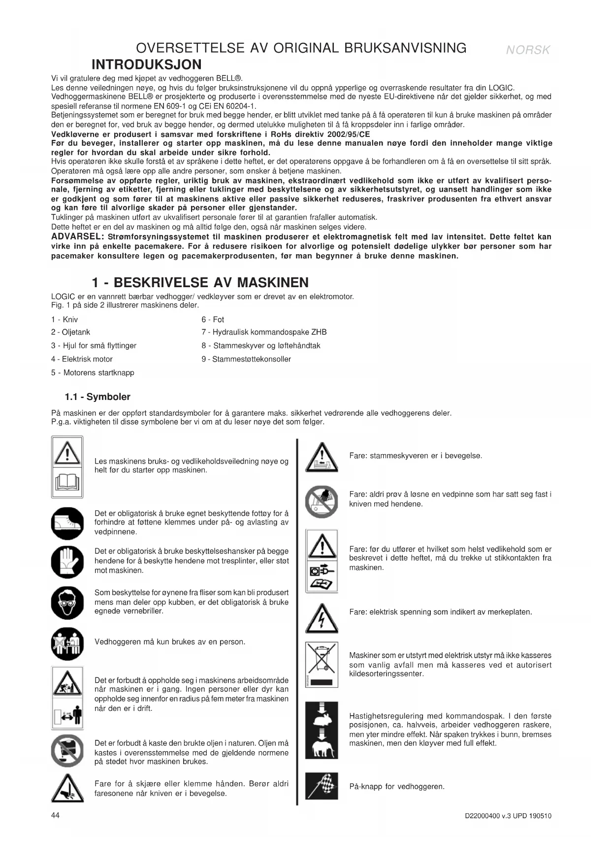 Vedhoggermaskinene BELL® er prosjekterte og produserte i overensstemmelse med de nyeste EU-direktivene när det gjelder sikkerhet, og med spesiell referanse til normene EN 609-1 og CEi EN 60204-1.
