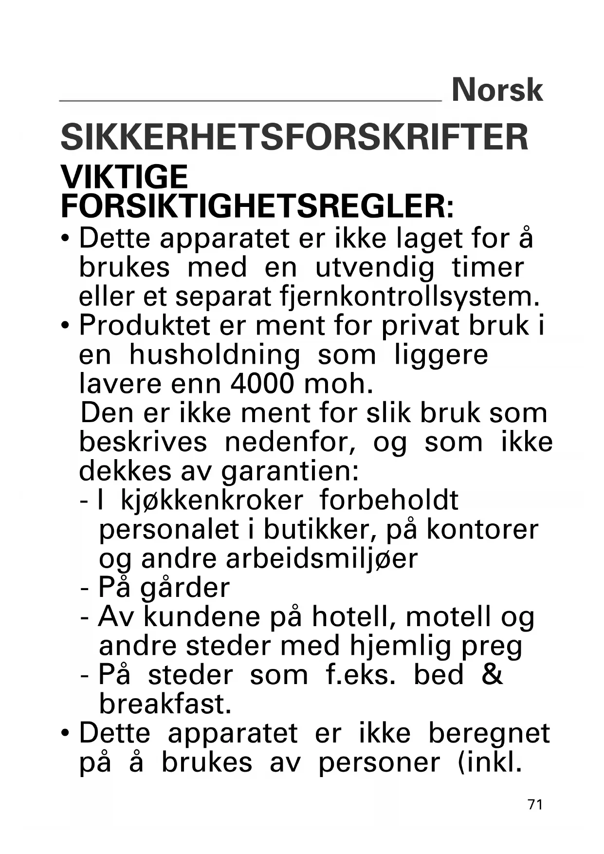 - Produktet er ment for privat bruk i en husholdning som liggere lavere enn 4000 moh. Den er ikke ment for slik bruk som beskrives nedenfor, og som ikke dekkes av garantien: - I kjøkkenkroker forbeholdt personalet i butikker, på kontorer og andre arbeidsmiljøer - På gårder - Av kundene på hotell, motell og andre steder med hjemlig preg - På steder som f.eks. bed & breakfast.