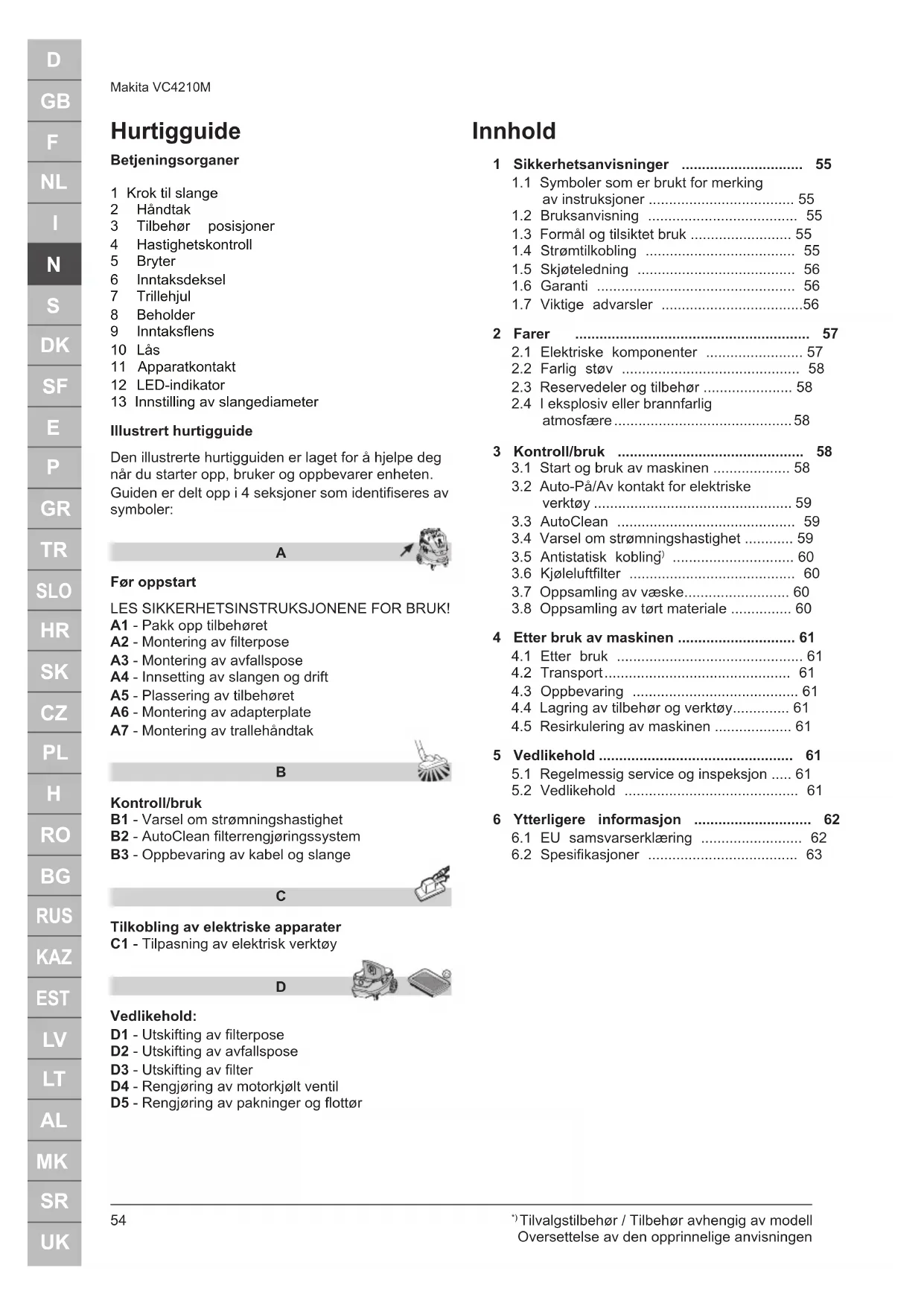 Vedlikehold: D1 - Utskifting av filterpose D2 - Utskifting av avfallspose D3 - Utskifting av filter D4 - Rengjøring av motorkjølt ventil D5 - Rengjøring av pakninger og flottør Innhold 1 Sikkerhetsanvisninger .............................. 55