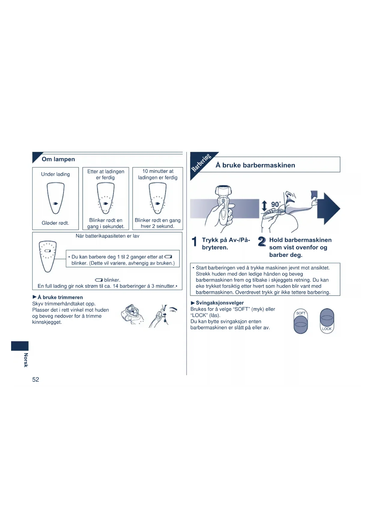 Svingaksjonsvelger Brukes for å velge “SOFT” (myk) eller “LOCK” (lås). Du kan bytte svingaksjon enten barbermaskinen er slått på eller av. SOFT LOCK