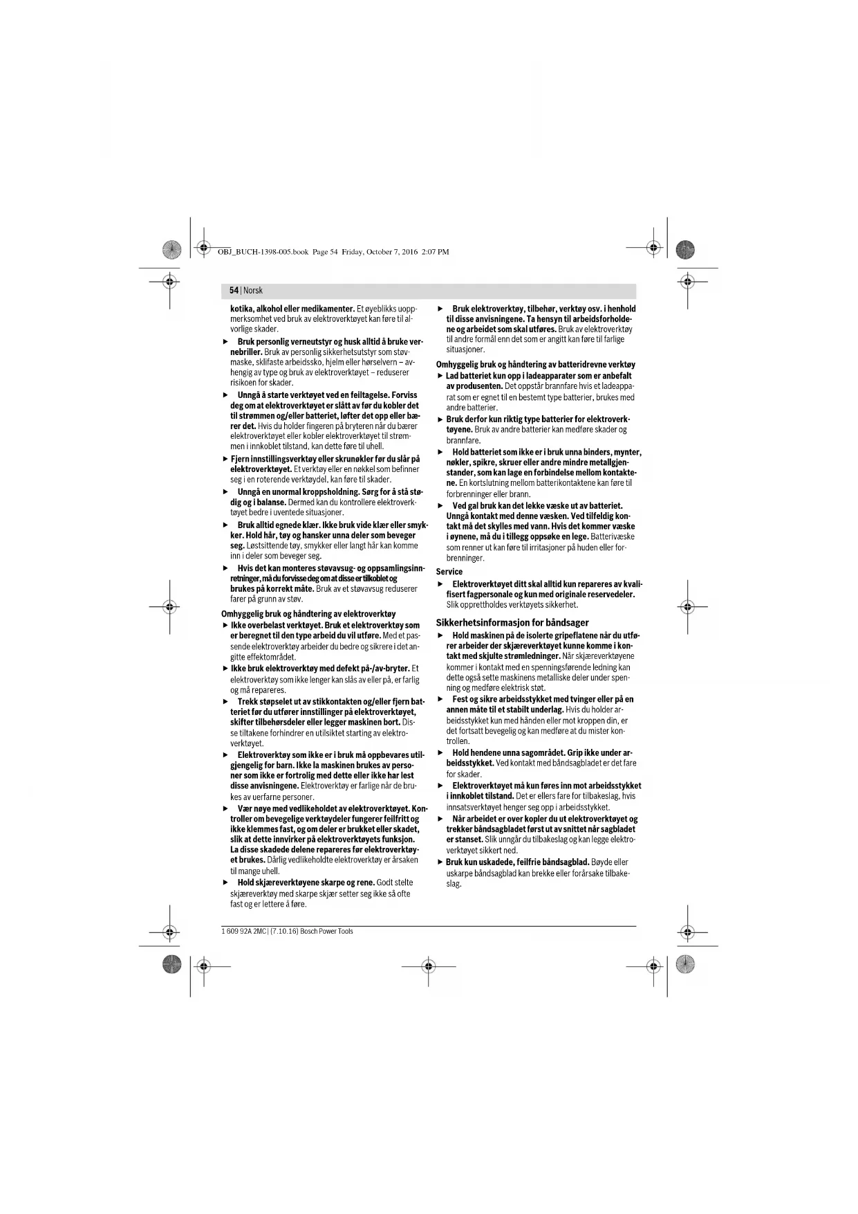 Bruk derfor kun riktig type batterier for elektroverk- tøyene. Bruk av andre batterier kan medføre skader og brannfare. Hold batteriet som ikke er i bruk unna binders, mynter, nøkler, spikre, skruer eller andre mindre metallgjen- stander, som kan lage en forbindelse mellom kontakte- ne. En kortslutning mellom batterikontaktene kan føre til forbrenninger eller brann. Ved gal bruk kan det lekke væske ut av batteriet. Unngå kontakt med denne væsken. Ved tilfeldig kon- takt må det skylles med vann. Hvis det kommer væske i øynene, må du i tillegg oppsøke en lege. Batterivæske som renner ut kan føre til irritasjoner på huden eller for- brenninger. Service Elektroverktøyet ditt skal alltid kun repareres av kvali- fisert fagpersonale og kun med originale reservedeler. Slik opprettholdes verktøyets sikkerhet. Sikkerhetsinformasjon for båndsager Hold maskinen på de isolerte gripeflatene når du utfø- rer arbeider der skjæreverktøyet kunne komme i kon- takt med skjulte strømledninger. Når skjæreverktøyene kommer i kontakt med en spenningsførende ledning kan dette også sette maskinens metalliske deler under spen- ning og medføre elektrisk støt. Fest og sikre arbeidsstykket med tvinger eller på en annen måte til et stabilt underlag. Hvis du holder ar- beidsstykket kun med hånden eller mot kroppen din, er det fortsatt bevegelig og kan medføre at du mister kon- trollen. Hold hendene unna sagområdet. Grip ikke under ar- beidsstykket. Ved kontakt med båndsagbladet er det fare for skader. Elektroverktøyet må kun føres inn mot arbeidsstykket i innkoblet tilstand. Det er ellers fare for tilbakeslag, hvis innsatsverktøyet henger seg opp i arbeidsstykket. Når arbeidet er over kopler du ut elektroverktøyet og trekker båndsagbladet først ut av snittet når sagbladet er stanset. Slik unngår du tilbakeslag og kan legge elektro- verktøyet sikkert ned. Bruk kun uskadede, feilfrie båndsagblad. Bøyde eller uskarpe båndsagblad kan brekke eller forårsake tilbake- slag. OBJ_BUCH-1398-005.book Page 54 Friday, October 7, 2016 2:07 PMNorsk | 55 Bosch Power Tools 1 609 92A 2MC | (7.10.16) Hold smøremidler eller olje unna båndsagbladet. Tørk overflødig olje godt av før du skjærer. Båndsagbladet kan ellers skli. Ikke gi sterkt trykk på båndsagbladet i løpet av arbei- det. For sterkt trykk kan føre til at båndsagbladet sklir eller brekker. Det er fare for skader. Brems ikke båndsagbladet etter utkoplingen ved å trykke det mot siden. Båndsagbladet kan skades, brekke eller forårsake tilbakeslag. Ikke ta på båndsagbladet etter arbeidet før det er av- kjølt. Båndsagbladet blir svært varmt under arbeidet. Hold elektroverktøyet fast med begge hender under ar- beidet og sørg for å stå stødig. Elektroverktøyet føres sikrere med to hender. Vent til elektroverktøyet er stanset helt før du legger det ned. Innsatsverktøyet kan kile seg fast og føre til at du mister kontrollen over elektroverktøyet. Batteriet må ikke åpnes. Det er fare for kortslutning. Beskytt batteriet mot varme, f.eks. også mot permanent solinnvirkning, ild, vann og fuktig- het. Det er fare for eksplosjoner. Ved skader og usakkyndig bruk av batteriet kan det slippe ut damp. Tilfør frisk luft og gå til lege hvis det oppstår helseproblemer. Dampene kan irritere ånde- drettsorganene. Bruk batteriet kun i kombinasjon med Bosch el-verk- tøyet. Kun slik beskyttes batteriet mot farlig overbelast- ning. Bruk kun originale Bosch batterier med en spenning som er angitt på typeskiltet til elektroverktøyet ditt. Ved bruk av andre batterier, f.eks. etterligninger, resirku- lerte batterier eller batterier fra andre produsenter, er det fare for fysiske og materialle skader hvis batteriene eksplo- derer. Produkt- og ytelsesbeskrivelse Les gjennom alle advarslene og anvisninge- ne. Feil ved overholdelsen av advarslene og nedenstående anvisninger kan medføre elek- triske støt, brann og/eller alvorlige skader. Brett ut utbrettssiden med bildet av maskinen, og la denne siden være utbrettet mens du leser bruksanvisningen. Formålsmessig bruk Elektroverktøyet er beregnet til å utføre kappinger kunststoff, metall og gummi på faste underlag. Det er egnet til rette snitt med en gjæringsvinkel på opp til 45°. Følg sagbladanbefalin- gene. Lyset til dette elektroverktøyet brukes til å belyse selve ar- beidsområdet, og er ikke egnet som rombelysning i boliger. Illustrerte komponenter Nummereringen av de illustrerte komponentene gjelder for bildet av elektroverktøyet på illustrasjonssiden. 1 Batteri * 2 Lampen «Power Light» 3 Innkoblingssperre for på-/av-bryter 4 På-/av-bryter 5 Føringshjelp 6 Båndsagblad * 7 Dreieretningspil på huset 8 Spak for forspenning båndsagblad 9 Ekstrahåndtak (isolert grepflate) 10 Batteri-låsetast* 11 Deksel for båndsagblad 12 Skrue 13 Sagbladføring 14 Håndtak (isolert grepflate) 15 Tast for ladetilstandsindikator* 16 Batteri-ladeindikator* 17 Rull for båndsagblad 18 Gjengeboring *Illustrert eller beskrevet tilbehør inngår ikke i standard-leveran- sen. Det komplette tilbehøret finner du i vårt tilbehørsprogram. Tekniske data Støy-/vibrasjonsinformasjon Måleverdier for lyden funnet i henhold til EN 60745. Det typiske A-bedømte lydtrykknivået for maskinen er 79 dB(A). Usikkerhet K=3 dB. Støynivået ved arbeid kan overskride 80 dB(A). Bruk hørselvern! Totale svingningsverdier a