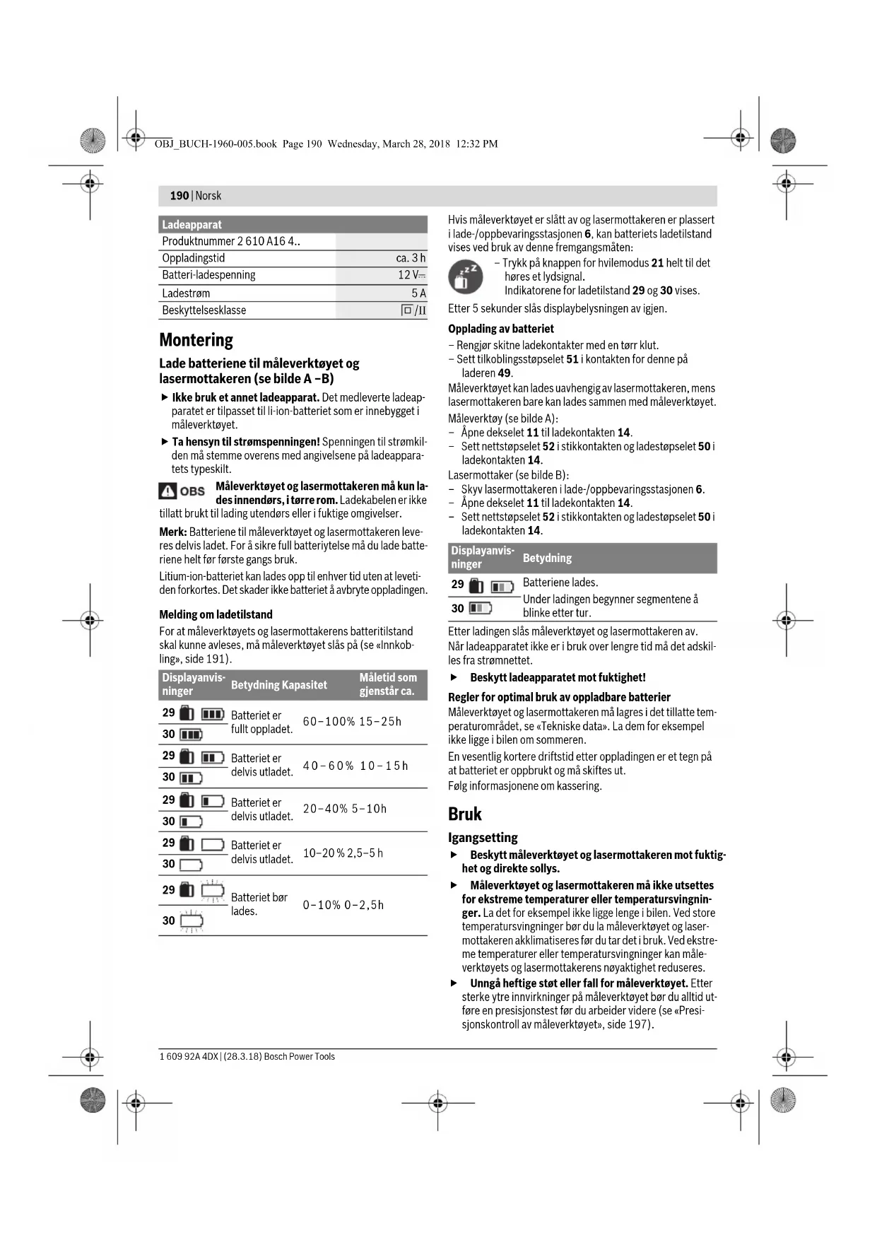 Serienummeret 27 på typeskiltet identifiserer din lasermottaker/fjern- kontroll entydig. OBJ_BUCH-1960-005.book Page 189 Wednesday, March 28, 2018 12:32 PM190 | Norsk 1 609 92A 4DX | (28.3.18) Bosch Power Tools Montering Lade batteriene til måleverktøyet og lasermottakeren (se bilde A –B) Ikke bruk et annet ladeapparat. Det medleverte ladeap- paratet er tilpasset til li-ion-batteriet som er innebygget i måleverktøyet. Ta hensyn til strømspenningen! Spenningen til strømkil- den må stemme overens med angivelsene på ladeappara- tets typeskilt. Måleverktøyet og lasermottakeren må kun la- des innendørs, i tørre rom. Ladekabelen er ikke tillatt brukt til lading utendørs eller i fuktige omgivelser. Merk: Batteriene til måleverktøyet og lasermottakeren leve- res delvis ladet. For å sikre full batteriytelse må du lade batte- riene helt før første gangs bruk. Litium-ion-batteriet kan lades opp til enhver tid uten at leveti- den forkortes. Det skader ikke batteriet å avbryte oppladingen. Melding om ladetilstand For at måleverktøyets og lasermottakerens batteritilstand skal kunne avleses, må måleverktøyet slås på (se «Innkob- ling», side 191). Hvis måleverktøyet er slått av og lasermottakeren er plassert i lade-/oppbevaringsstasjonen 6, kan batteriets ladetilstand vises ved bruk av denne fremgangsmåten: Etter 5 sekunder slås displaybelysningen av igjen. Opplading av batteriet – Rengjør skitne ladekontakter med en tørr klut. – Sett tilkoblingsstøpselet 51 i kontakten for denne på laderen 49. Måleverktøyet kan lades uavhengig av lasermottakeren, mens lasermottakeren bare kan lades sammen med måleverktøyet. Måleverktøy (se bilde A): – Åpne dekselet 11 til ladekontakten 14. – Sett nettstøpselet 52 i stikkontakten og ladestøpselet 50 i ladekontakten 14. Lasermottaker (se bilde B): – Skyv lasermottakeren i lade-/oppbevaringsstasjonen 6. – Åpne dekselet 11 til ladekontakten 14. – Sett nettstøpselet 52 i stikkontakten og ladestøpselet 50 i ladekontakten 14. Etter ladingen slås måleverktøyet og lasermottakeren av. Når ladeapparatet ikke er i bruk over lengre tid må det adskil- les fra strømnettet. Beskytt ladeapparatet mot fuktighet! Regler for optimal bruk av oppladbare batterier Måleverktøyet og lasermottakeren må lagres i det tillatte tem- peraturområdet, se «Tekniske data». La dem for eksempel ikke ligge i bilen om sommeren. En vesentlig kortere driftstid etter oppladingen er et tegn på at batteriet er oppbrukt og må skiftes ut. Følg informasjonene om kassering. Bruk Igangsetting Beskytt måleverktøyet og lasermottakeren mot fuktig- het og direkte sollys. Måleverktøyet og lasermottakeren må ikke utsettes for ekstreme temperaturer eller temperatursvingnin- ger. La det for eksempel ikke ligge lenge i bilen. Ved store temperatursvingninger bør du la måleverktøyet og laser- mottakeren akklimatiseres før du tar det i bruk. Ved ekstre- me temperaturer eller temperatursvingninger kan måle- verktøyets og lasermottakerens nøyaktighet reduseres. Unngå heftige støt eller fall for måleverktøyet. Etter sterke ytre innvirkninger på måleverktøyet bør du alltid ut- føre en presisjonstest før du arbeider videre (se «Presi- sjonskontroll av måleverktøyet», side 197). Ladeapparat Produktnummer 2 610 A16 4.. Oppladingstid ca. 3 h Batteri-ladespenning 12 V Ladestrøm