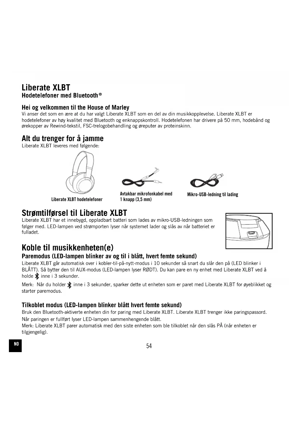 Hei og velkommen til the House of Marley Vi anser det som en ære at du har valgt Liberate XLBT som en del av din musikkopplevelse. Liberate XLBT er hodetelefoner av høy kvalitet med Bluetooth og enknappskontroll. Hodetelefonen har drivere på 50 mm, hodebånd og ørekopper av Rewind-tekstil, FSC-trelogobehandling og øreputer av proteinskinn. Alt du trenger for å jamme Liberate XLBT leveres med følgende: Liberate XLBT hodetelefoner Avtakbar mikrofonkabel med 1 knapp (3,5 mm) Mikro-USB-ledning til lading Strømtilførsel til Liberate XLBT Liberate XLBT har et innebygd, oppladbart batteri som lades av mikro-USB-ledningen som følger med. LED-lampen ved strømporten lyser når systemet lader og slås av når batteriet er fulladet. Koble til musikkenheten(e) Paremodus (LED-lampen blinker av og til i blått, hvert femte sekund) Liberate XLBT går automatisk over i kobler-til-på-nytt-modus i 10 sekunder så snart du slår den på (LED blinker i BLÅTT). Så bytter den til AUX-modus (LED-lampen lyser RØDT). Du kan pare en ny enhet med Liberate XLBT ved å holde inne i 3 sekunder. Merk: Når du holder inne i 3 sekunder, sparker dette ut enheten som er paret med Liberate XLBT for øyeblikket og starter paremodus. Tilkoblet modus (LED-lampen blinker blått hvert femte sekund) Bruk den Bluetooth-aktiverte enheten din for paring med Liberate XLBT. Liberate XLBT trenger ikke paringspassord. Når paringen er fullført lyser LED-lampen sammenhengende blått. Merk: Liberate XLBT parer automatisk med den siste enheten som ble tilkoblet når den slås PÅ (når enheten er tilgjengelig). NO55 Lade enheten Det sitter en hendig micro-USB-port på Liberate XLBTs høyre ørekopp der du kan lade enhetene mens den er på eller av. Bruk ledningen som fulgte med enheten til å lade. MERK: Ikke alle enheter er kompatible med micro-USB-porten. Skifte batteri Liberate XLBT-enheten din har et oppladbart batteri som er konstruert for å vare like lenge som produktet. Skulle det uforutsette skje at du trenger et nytt batteri, ta kontakt med kundetjenesten som vil gi deg informasjon om garantien og utskifting-service for batteri ved utgått garanti. Berør for volumkontroll Hold inne for volumopp-/nedtrapping Berør for Bluetooth-tilkobling (til siste enhet) Hold inne for paring (eller frakobling og paring) Berør for å sette gjeldende spor på pause Berør for å spille sporet som står på pause Berør for å besvare innkommende samtale Berør for å avslutte gjeldende samtale Hold inne for å slå «PÅ» Trykk for å sjekke batterinivå Hold inne for å slå «AV» Berør for å bytte spor Hold inne for å spole frem-/bakover56 Mikrofonkompabel og enknappskontroll Integrert mikrofon gjør det mulig å foreta handsfree-samtaler. Trykk på knappen for å svare og trykk en gang l for å avslue samtalen.Spore- og spille/pause-funksjonene som vist på illustrasjonen fungerer kun med Apple-enheter. x1 x1