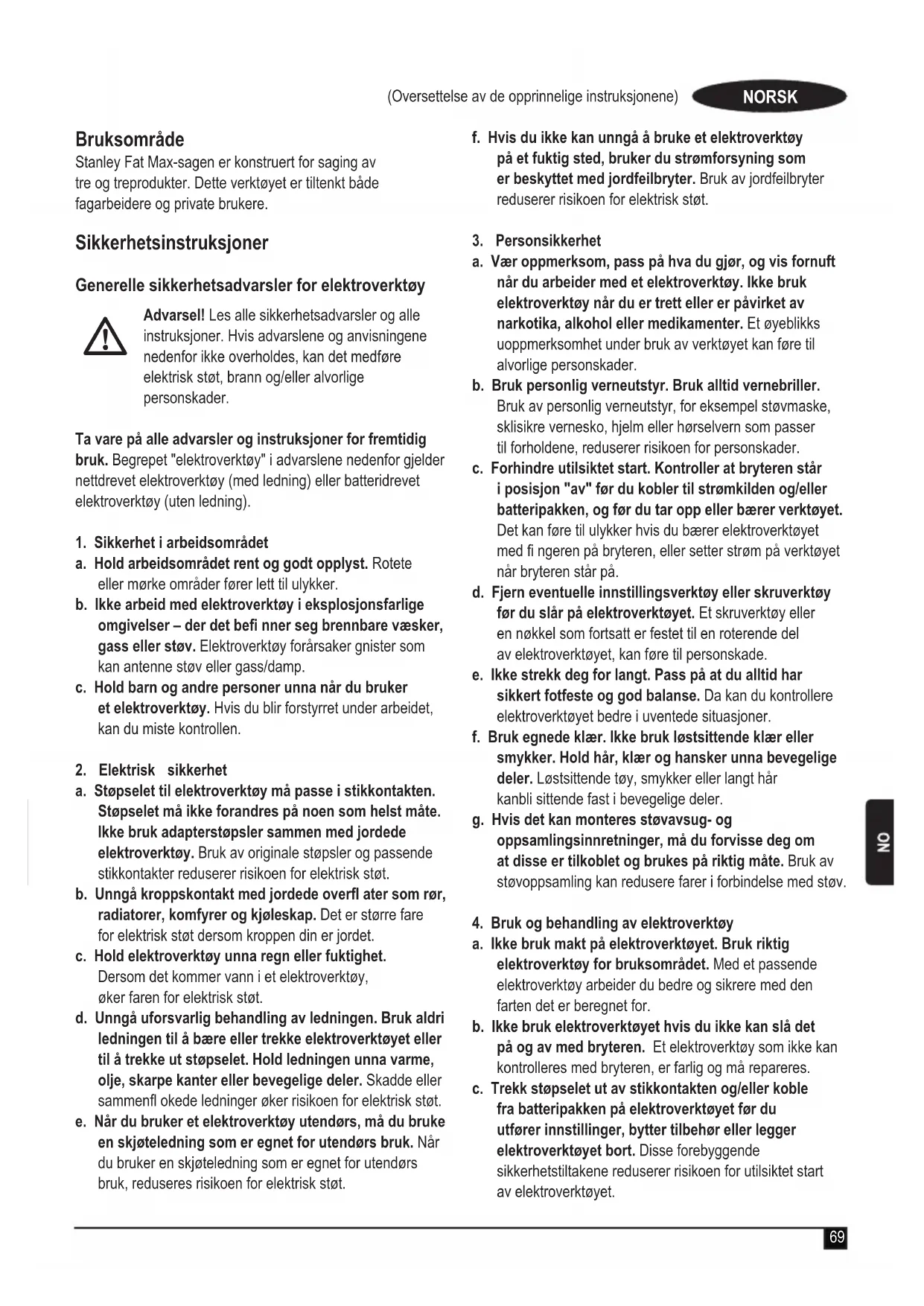 Advarsel! Les alle sikkerhetsadvarsler og alle instruksjoner. Hvis advarslene og anvisningene nedenfor ikke overholds, kan det medfrole elektrisk støt, brann og/eller alvorlige personskader.