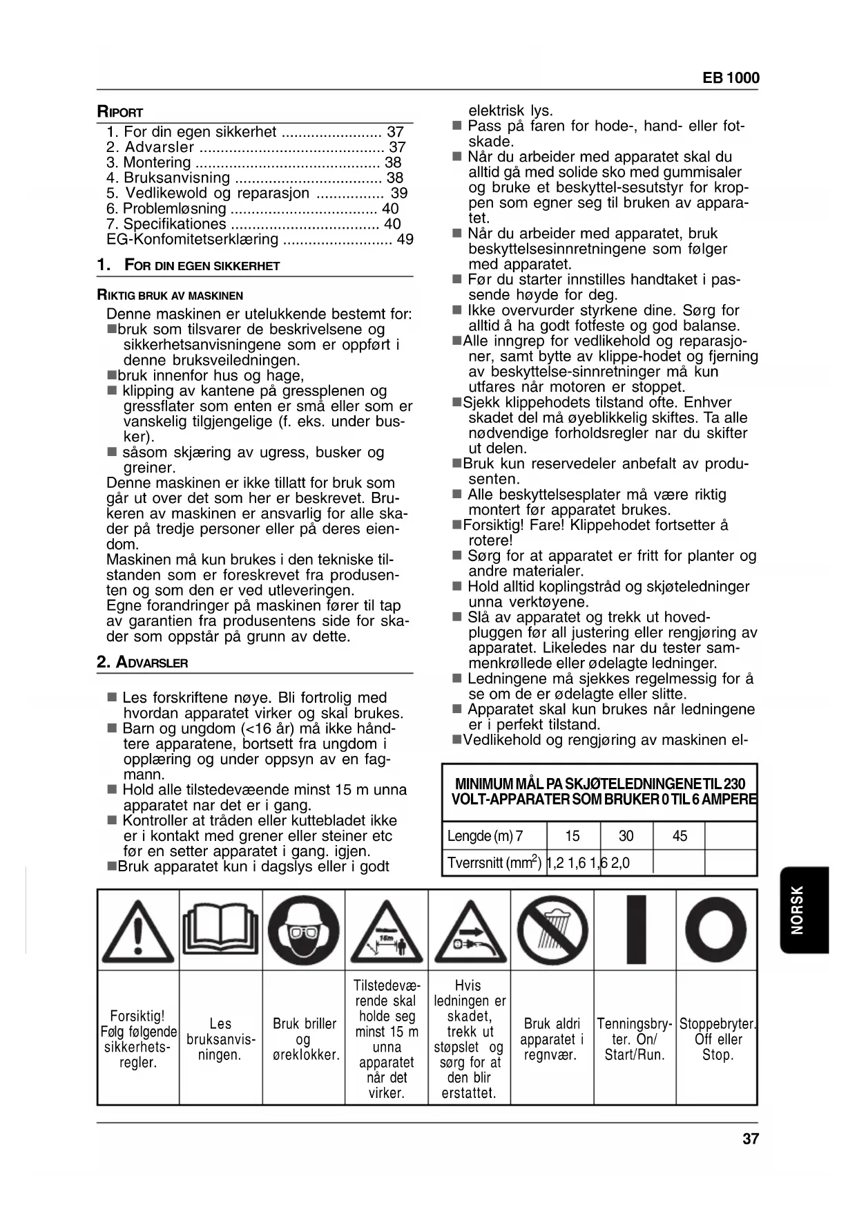 ørekIokker. Tilstedevæ- rende skal holde seg minst 15 m unna apparatet når det virker. Hvis ledningen er skadet, trekk ut støpslet og sørg for at den blir erstattet. Bruk aldri apparatet i regnvær. Tenningsbry- ter. On/ Start/Run. Stoppebryter. Off eller Stop. eb1000_nor.p65 10/03/03, 8:173738 EB 1000 ler innstilling av klippeposisjon må kun ut- føres når motoren er frakoplet og pluggen er tatt ut av stikkontakten. n SKJØTELEDNINGER - Se etter at alle skjøteledninger er i god stand. Sjekk at de er tilstrekkelig sterke til å tåle apparatets strømstyrke. Tabellen nedenfor viser hvil- ken størrelse som bør brukes alt etter ledningens lengde og strøm mstyrke. Der- som du er i tvil, bruk neste størrelse. For å unngå at apparatet kobles fra skjøte- ledningen mens det er i bruk, se neden- under. n Av sikkerhetsmessige årsaker må verk- tøyet koples til en strømkontakt beskyttet av en jordvernbryter med en maksimums- strøm på 30 mA. n Hvis nettkabelen kuttes under bruk med verktøyet, må støpslet trekkes ut av stik- kontakten med en gang.