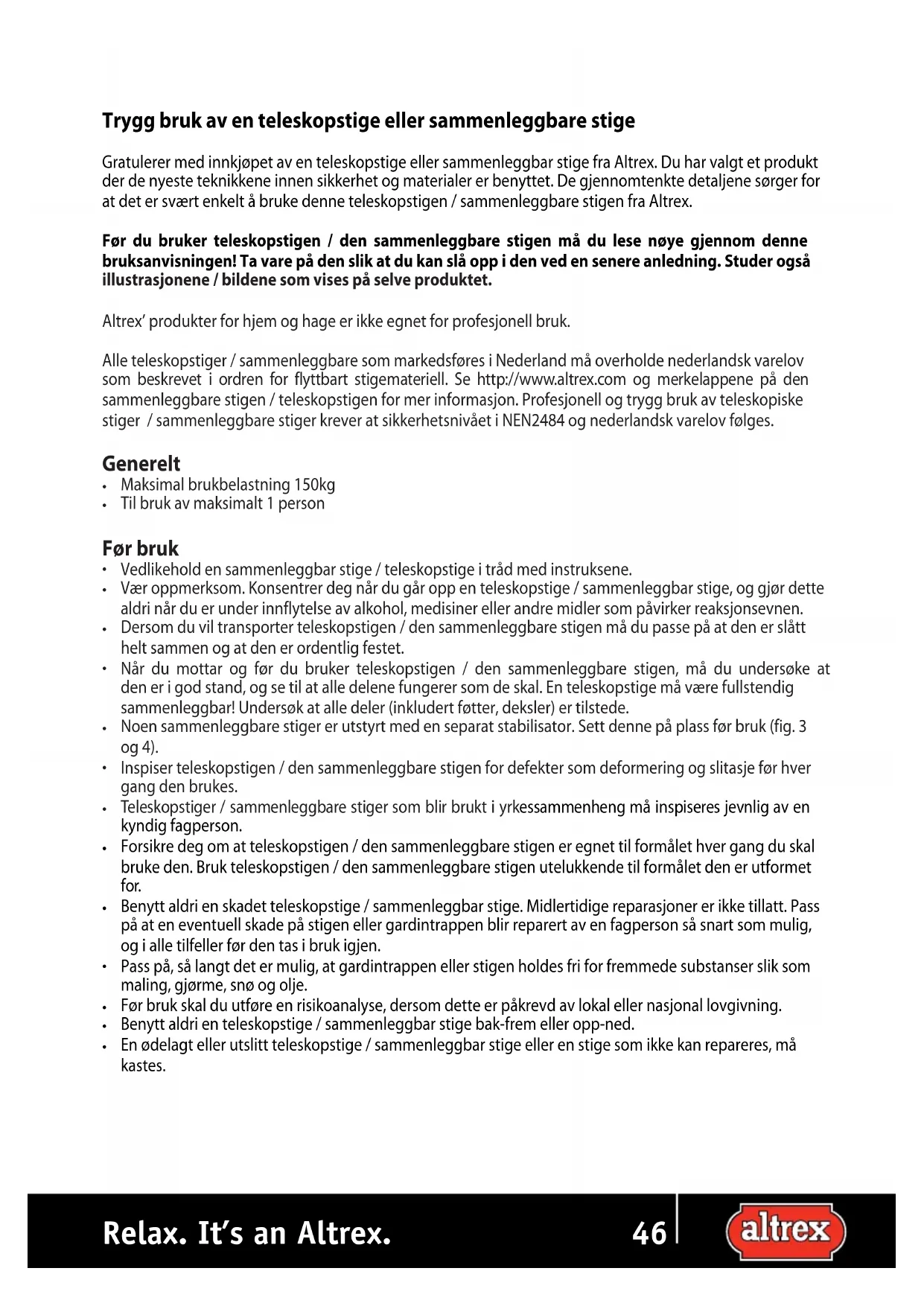 b.Trygg bruk av en teleskopstige eller sammenleggbare stige Gratulerer med innkjøpet av en teleskopstige eller sammenleggbar stige fra Altrex. Du har valgt et produkt der de nyeste teknikkene innen sikkerhet og materialer er benyttet. De gjennomtenkte detaljene sørger for at det er svært enkelt å bruke denne teleskopstigen / sammenleggbare stigen fra Altrex. Før du bruker teleskopstigen / den sammenleggbare stigen må du lese nøye gjennom denne bruksanvisningen! Ta vare på den slik at du kan slå opp i den ved en senere anledning. Studer også illustrasjonene / bildene som vises på selve produktet. Altrex’ produkter for hjem og hage er ikke egnet for profesjonell bruk. Alle teleskopstiger / sammenleggbare som markedsføres i Nederland må overholde nederlandsk varelov som beskrevet i ordren for flyttbart stigemateriell. Se http://www.altrex.com og merkelappene på den sammenleggbare stigen / teleskopstigen for mer informasjon. Profesjonell og trygg bruk av teleskopiske stiger / sammenleggbare stiger krever at sikkerhetsnivået i NEN2484 og nederlandsk varelov følges. Generelt Maksimal brukbelastning 150kg Til bruk av maksimalt 1 person Før bruk Vedlikehold en sammenleggbar stige / teleskopstige i tråd med instruksene. Vær oppmerksom. Konsentrer deg når du går opp en teleskopstige / sammenleggbar stige, og gjør dette aldri når du er under innflytelse av alkohol, medisiner eller andre midler som påvirker reaksjonsevnen. Dersom du vil transporter teleskopstigen / den sammenleggbare stigen må du passe på at den er slått helt sammen og at den er ordentlig festet. Når du mottar og før du bruker teleskopstigen / den sammenleggbare stigen, må du undersøke at den er i god stand, og se til at alle delene fungerer som de skal. En teleskopstige må være fullstendig sammenleggbar! Undersøk at alle deler (inkludert føtter, deksler) er tilstede. Noen sammenleggbare stiger er utstyrt med en separat stabilisator. Sett denne på plass før bruk (fig. 3 og 4). Inspiser teleskopstigen / den sammenleggbare stigen for defekter som deformering og slitasje før hver gang den brukes. Teleskopstiger / sammenleggbare stiger som blir brukt i yrkessammenheng må inspiseres jevnlig av en kyndig fagperson. Forsikre deg om at teleskopstigen / den sammenleggbare stigen er egnet til formålet hver gang du skal bruke den. Bruk teleskopstigen / den sammenleggbare stigen utelukkende til formålet den er utformet for. Benytt aldri en skadet teleskopstige / sammenleggbar stige. Midlertidige reparasjoner er ikke tillatt. Pass på at en eventuell skade på stigen eller gardintrappen blir reparert av en fagperson så snart som mulig, og i alle tilfeller før den tas i bruk igjen. Pass på, så langt det er mulig, at gardintrappen eller stigen holdes fri for fremmede substanser slik som maling, gjørme, snø og olje. Før bruk skal du utføre en risikoanalyse, dersom dette er påkrevd av lokal eller nasjonal lovgivning. Benytt aldri en teleskopstige / sammenleggbar stige bak-frem eller opp-ned. En ødelagt eller utslitt teleskopstige / sammenleggbar stige eller en stige som ikke kan repareres, må kastes.
