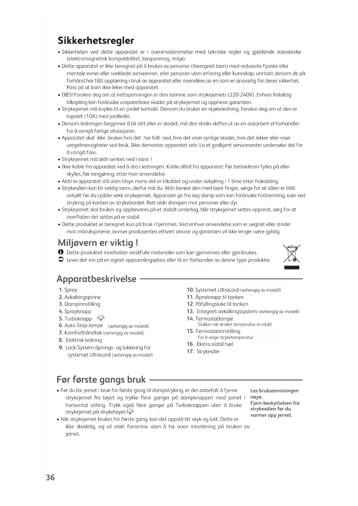 - Når strykejernet brukes for første gang, kan det oppstå litt røyk og lukt. Dette er ikke skadelig, og vil raskt forsvinne uten å ha noen innvirkning på bruken av jernet. Les bruksanvisningennøye.Fjern beskyttelsen frastrykesålen før duvarmer opp jernet. Sikkerhetsregler