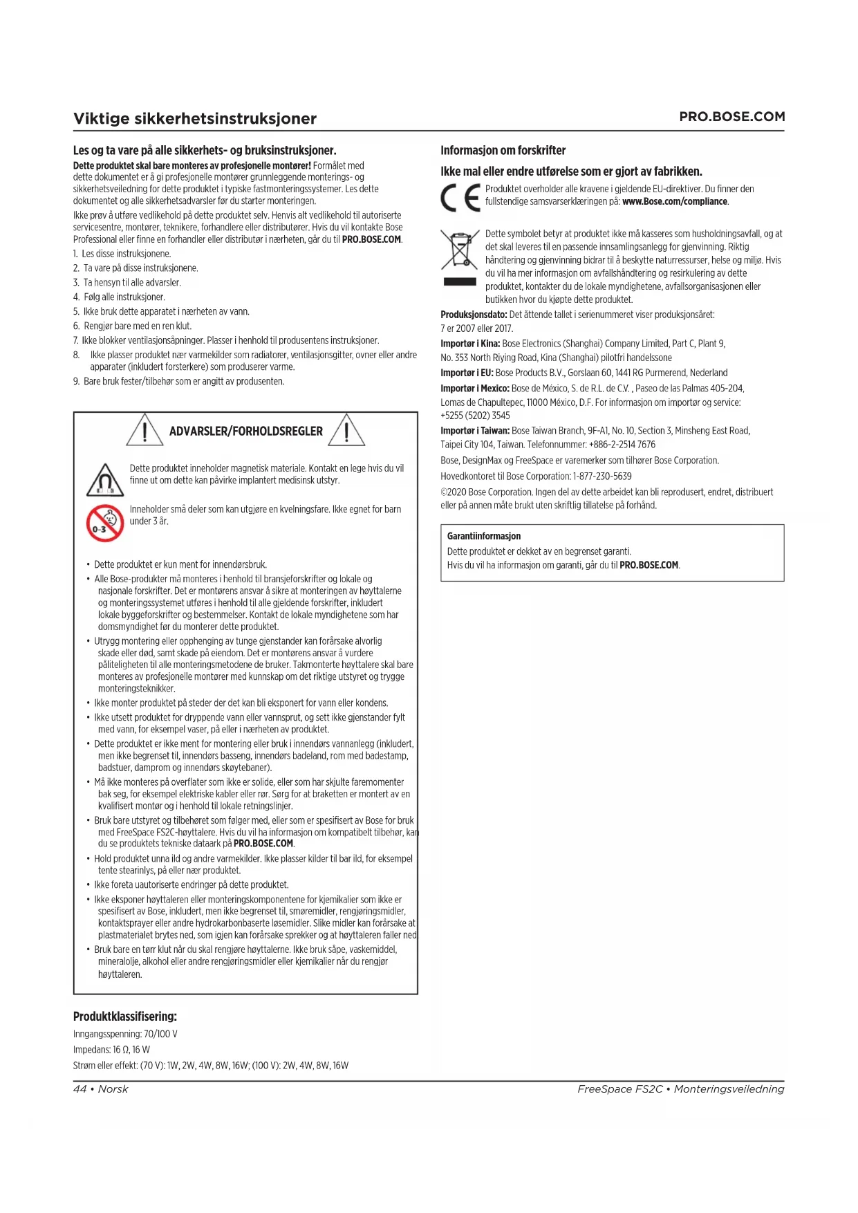 Informasjon om forskrifter Ikke mal eller endre utførelse som er gjort av fabrikken. Produktet overholder alle kravene i gjeldende EU-direktiver. Du finner den fullstendige samsvarserklæringen på: www.Bose.com/compliance. Dette symbolet betyr at produktet ikke må kasseres som husholdningsavfall, ogat det skal leveres til en passende innsamlingsanlegg for gjenvinning. Riktig håndtering og gjenvinning bidrar til å beskytte naturressurser, helse og miljø. Hvis du vil ha mer informasjon om avfallshåndtering og resirkulering av dette produktet, kontakter du de lokale myndighetene, avfallsorganisasjonen eller butikken hvor du kjøpte dette produktet. Produksjonsdato: Det åttende tallet i serienummeret viser produksjonsåret: 7 er 2007 eller 2017. Importør i Kina: Bose Electronics (Shanghai) Company Limited, Part C, Plant 9, No. 353 North Riying Road, Kina (Shanghai) pilotfri handelssone Importør i EU: Bose Products B.V., Gorslaan 60, 1441 RG Purmerend, Nederland Importør i Mexico: Bose de México, S. de R.L. de C.V. , Paseo de las Palmas 405-204, Lomas de Chapultepec, 11000 México, D.F. For informasjon om importør og service: +5255 (5202) 3545 Importør i Taiwan: Bose Taiwan Branch, 9F-A1, No. 10, Section 3, Minsheng East Road, Taipei City 104, Taiwan. Telefonnummer: +886-2-2514 7676 Bose, DesignMax og FreeSpace er varemerker som tilhører Bose Corporation. Hovedkontoret til Bose Corporation: 1-877-230-5639 ©2020 Bose Corporation. Ingen del av dette arbeidet kan bli reprodusert, endret, distribuert eller på annen måte brukt uten skriftlig tillatelse på forhånd. Garantiinformasjon Dette produktet er dekket av en begrenset garanti. Hvis du vil ha informasjon om garanti, går du til PRO.BOSE.COM. Produktklassifisering: Inngangsspenning: 70/100V Impedans: 16Ω, 16W Strøm eller eekt: (70V): 1W, 2W, 4W, 8W, 16W; (100V): 2W, 4W, 8W, 16W ADVARSLER/FORHOLDSREGLER Dette produktet inneholder magnetisk materiale. Kontakt en lege hvis du vil finne ut om dette kan påvirke implantert medisinsk utstyr. Inneholder små deler som kan utgjøre en kvelningsfare. Ikke egnet for barn under 3 år.