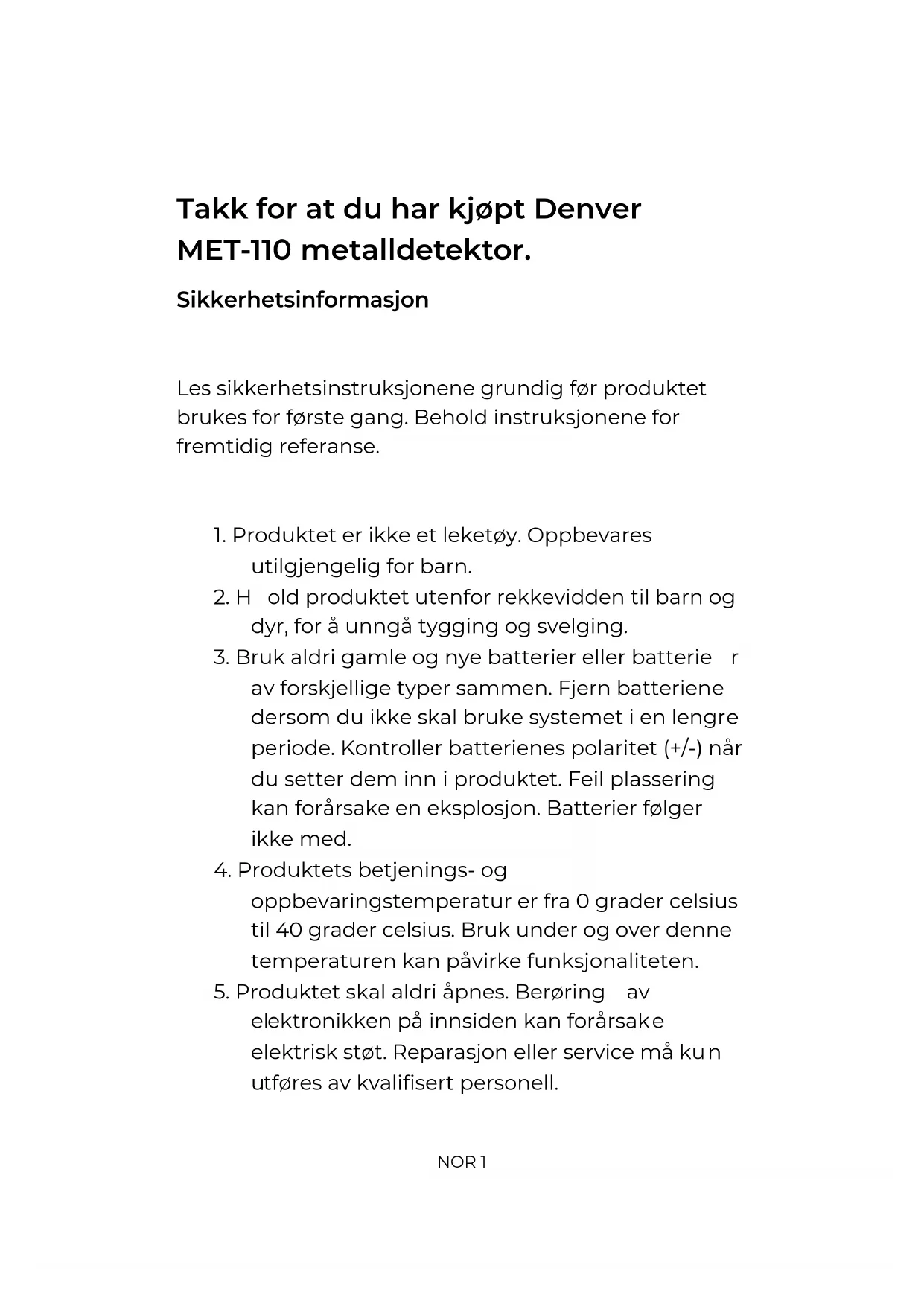 enver A/S Omega 5A, Soeften DK-8382 Hinnerup Tanska www.facebook.com/denver.euNOR 1 Takk for at du har kjøpt Denver MET-110 metalldetektor. Sikkerhetsinformasjon Les sikkerhetsinstruksjonene grundig før produktet brukes for første gang. Behold instruksjonene for fremtidig referanse.