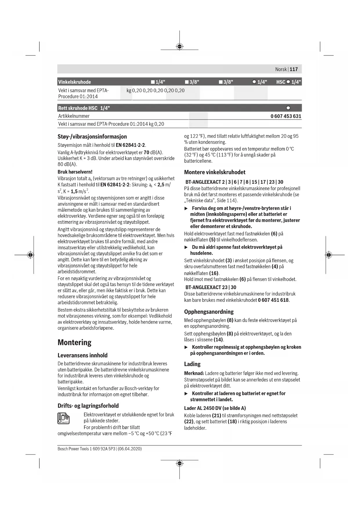 -navnet og -logoene er registrerte varemerker som tilhører Bluetooth SIG, Inc. Enhver bruk av navnet/ logoen av Robert Bosch Power Tools GmbH skjer på lisens. Produktbeskrivelse og ytelsesspesifikasjoner Les sikkerhetsanvisningene og instruksene. Hvis ikke sikkerhetsanvisningene og instruksene tas til følge, kan det oppstå elektrisk støt, brann og/eller alvorlige personskader. Se illustrasjonene i begynnelsen av bruksanvisningen. Forskriftsmessig bruk Skrusystemet BT-EXACT/BT-ANGLEEXACT og EXAConnecT er beregnet for skruing og løsing av skruer og for tiltrekking og løsing av muttere i det angitte dimensjons- og effektområdet. Det er ikke beregnet for dokumentering av tiltrekkingsmoment eller -vinkel på en skruforbindelse. Skrusystemet gir mulighet til trådløs overføring av skrusignaler ved bruk av Bluetooth® wireless technology. Ikke OK- og OK-signaler (skruforbindelse i orden / ikke i orden) fra de batteridrevne skrumaskinene for industribruk BT-EXACT og BT-ANGLEEXACT sendes til basisstasjonen EXAConnecT. Uten basisstasjonen EXAConnecT er det ikke mulig å starte skrumaskinene i serien BT-EXACT og BT- ANGLEEXACT. Skrumaskinene er sperret ved levering, og kan bare aktiveres av basisstasjonen EXAConnecT. Følg brukanvisningen for basisstasjonen EXAConnecT. Ta først basisstasjonen EXAConnecT i drift. Illustrerte komponenter Nummereringen av de illustrerte komponentene gjelder for bildet av elektroverktøyet på illustrasjonssiden. (1) Innsatsverktøy (f.eks.pipe) (2) Verktøyholder (3) Vinkelskruhode (4) Fastnøkkel nøkkelvidde 27mm (5) Nøkkelflate på vinkelhodeflensen (6) Fastnøkkel nøkkelvidde 22 mm Bosch Power Tools 1 609 92A 5P3 | (06.04.2020)114 | Norsk (7) Glidebryter for turtallsinnstilling (8) Opphengsbøyle (9) LED-indikator for skrukoblinger (10) LED-indikator Bluetooth® (11) LED-indikator batteriladenivå (12) Av/på-bryter (13) Dreieretningsvelger (14) Festeslisse for opphengsbøyle (15) LED-holder (16) Nøkkelflate på overfalsmutter (17) Utløserknapp for batteri (18) Batteri med APT-stikkontakt (19) Markeringsring (20) Arbeidslys (21) Lader (22) Nettstøpsel (23) Grønn LED-indikator på laderen (24) Rød LED-indikator på laderen (25) Hurtigskiftechuck (26) Innstillingsverktøy (27) Unbrakonøkkel (28) Innstillingsskive (29) Låseskive (30) Hulrom i huset (31) Håndtak (isolert grepsflate) Illustrert eller beskrevet tilbehør inngår ikke i standard- leveransen. Det komplette tilbehøret finner du i vårt tilbehørsprogram. Tekniske data Batteridrevet skrumaskin for industribruk BT-EXACT