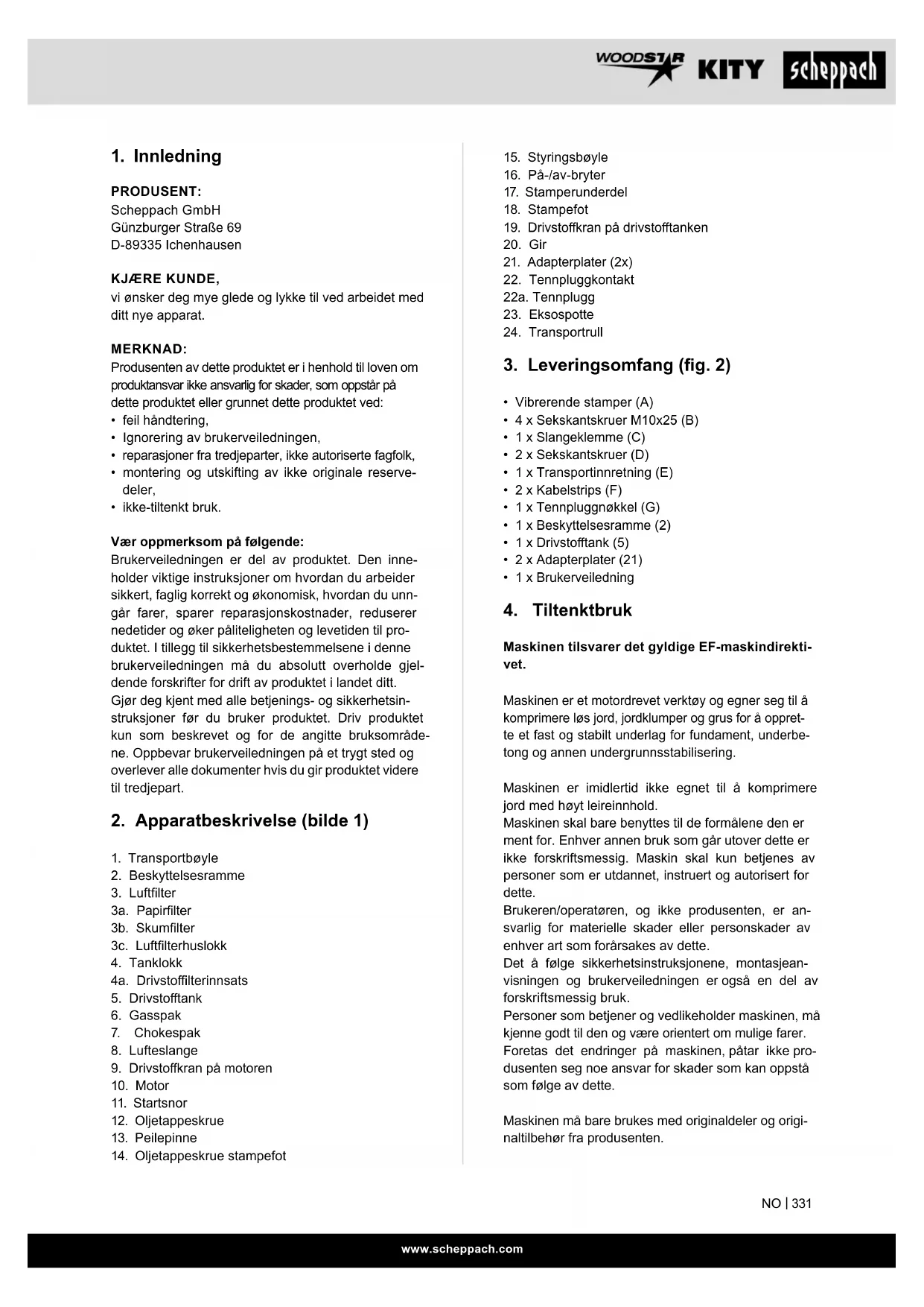PRODUSENT: Scheppach GmbH Günzburger Straße 69 D-89335 Ichenhausen KJÆRE KUNDE, vi ønsker deg mye glede og lykke til ved arbeidet med ditt nye apparat. MERKNAD: Produsenten av dette produktet er i henhold til loven om produktansvar ikke ansvarlig for skader, som oppstår på dette produktet eller grunnet dette produktet ved:
