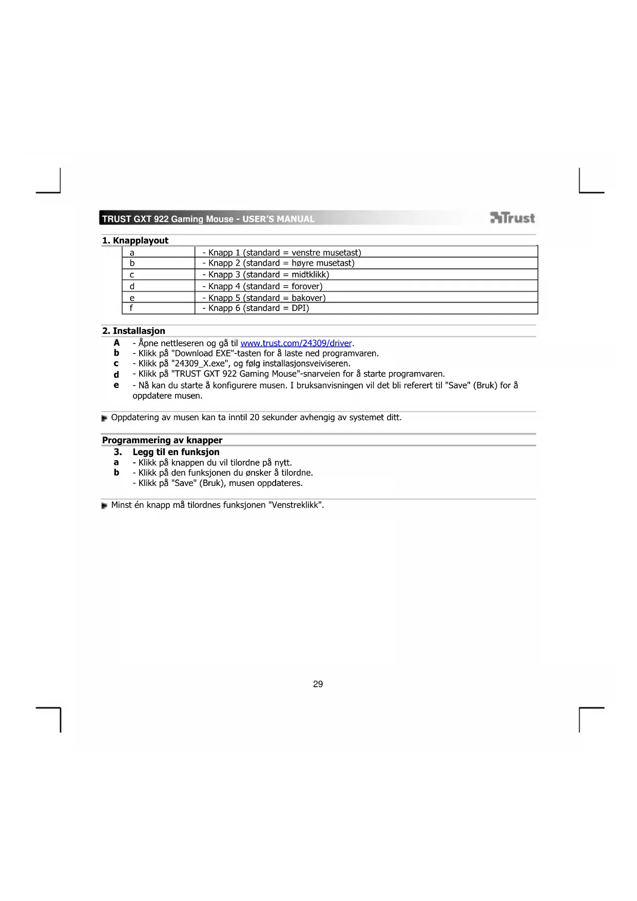 - Åpne nettleseren og gå til www.trust.com/24309/driver. - Klikk på "Download EXE"-tasten for å laste ned programvaren. - Klikk på "24309_X.exe", og følg installasjonsveiviseren. - Klikk på "TRUST GXT 922 Gaming Mouse"-snarveien for å starte programvaren. - Nå kan du starte å konfigurere musen. I bruksanvisningen vil det bli referert til "Save" (Bruk) for å oppdatere musen. Oppdatering av musen kan ta inntil 20 sekunder avhengig av systemet ditt. Programmering av knapper