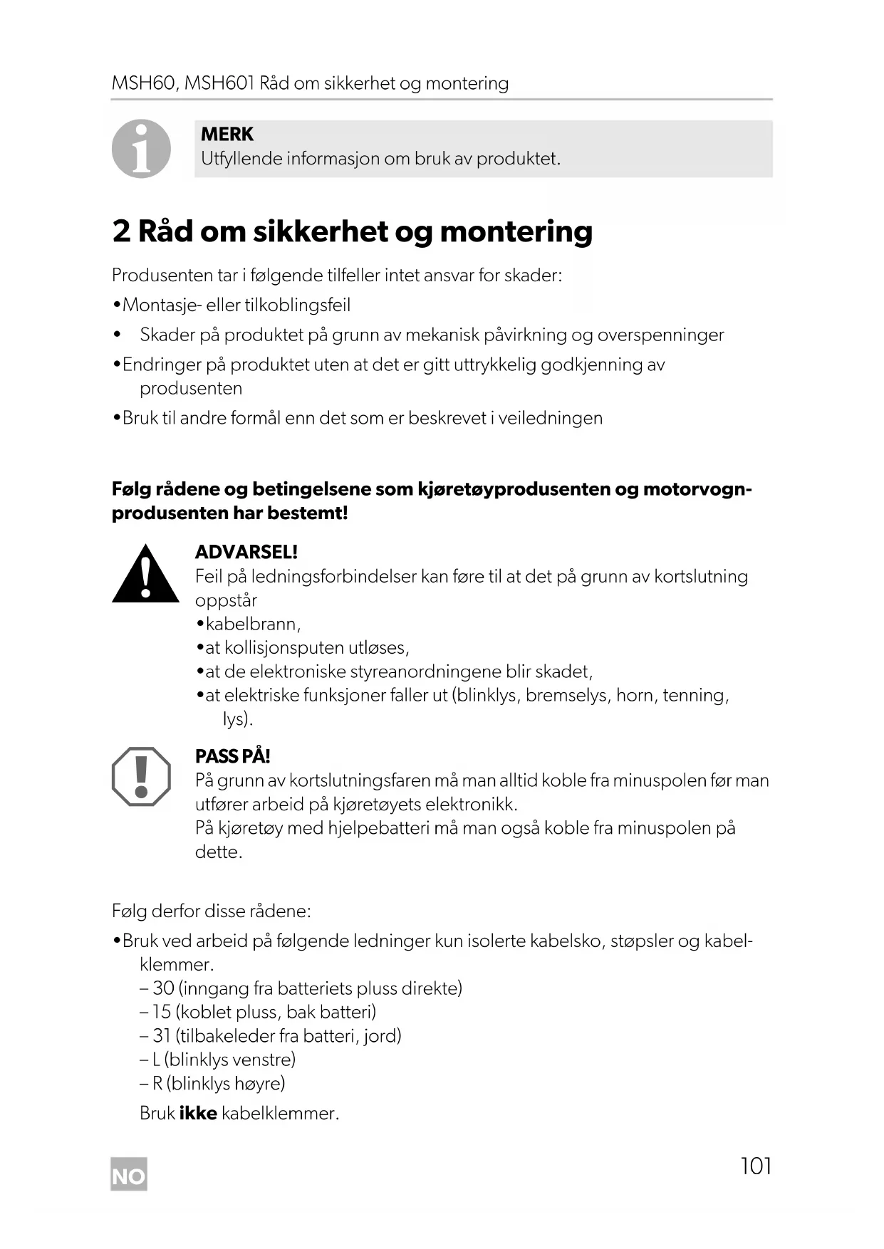 - Varmluftpistol (13) PASS PÅ! For kjøretøy med sidekollisjonsputer i ryggstø, setesensorer eller barnesetesensor må kjøretøyprodusentens anvisninger følges. MSH60-MSH601-IO-16s.book Seite 105 Dienstag, 30. August 2016 6:23 18NO Montere setevarme MSH60, MSH601
