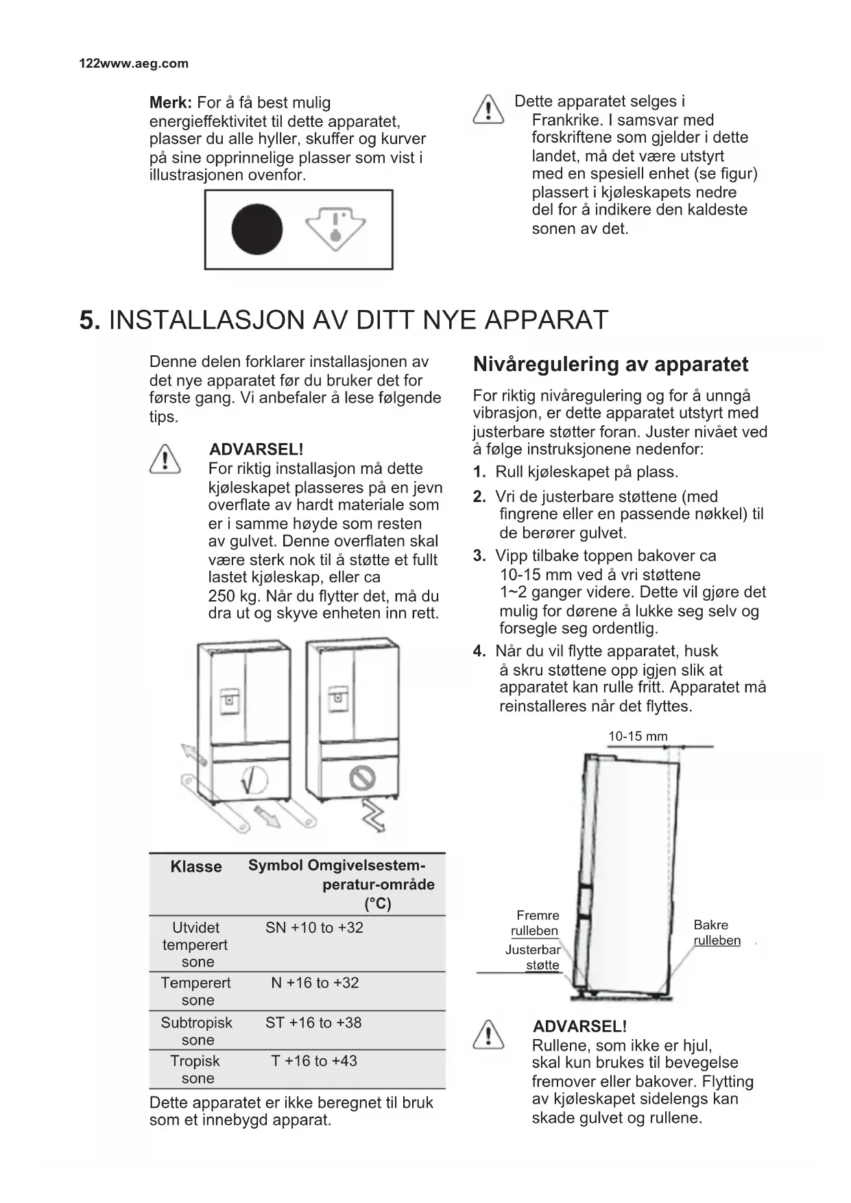 Denne delen forklarer installasjonen av det nye apparatet før du bruker det for første gang. Vi anbefaler å lese følgende tips. ADVARSEL! For riktig installasjon må dette kjøleskapet plasseres på en jevn overate av hardt materiale som er i samme høyde som resten av gulvet. Denne overaten skal være sterk nok til å støtte et fullt lastet kjøleskap, eller ca 250 kg. Når du ytter det, må du dra ut og skyve enheten inn rett. Klasse Symbol Omgivelsestem- peratur-område (°C) Utvidet temperert sone SN +10 to +32 Temperert sone N +16 to +32 Subtropisk sone ST +16 to +38 Tropisk sone T +16 to +43 Dette apparatet er ikke beregnet til bruk som et innebygd apparat. Nivåregulering av apparatet For riktig nivåregulering og for å unngå vibrasjon, er dette apparatet utstyrt med justerbare støtter foran. Juster nivået ved å følge instruksjonene nedenfor: