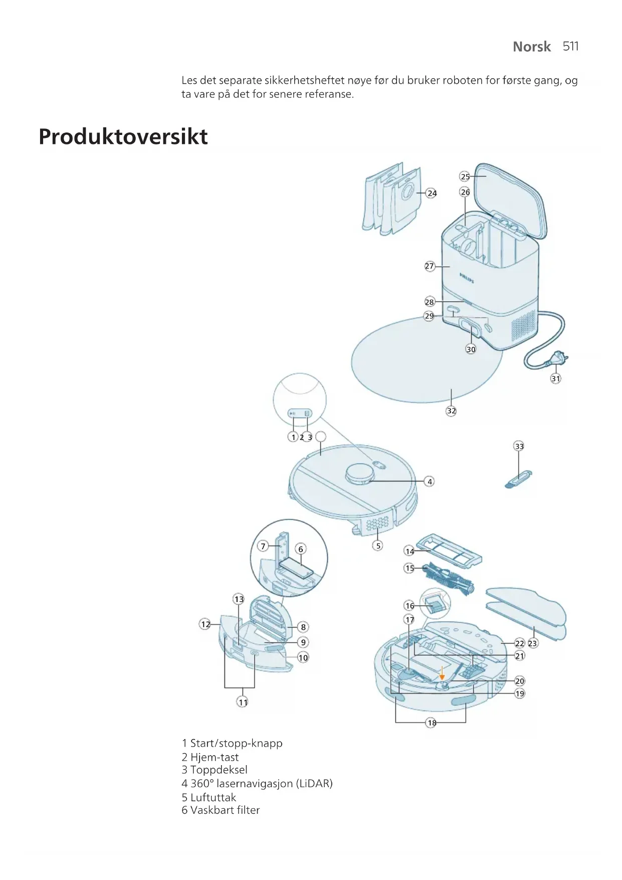 1 Start/stopp-knapp 2 Hjem-tast 3 Toppdeksel 4 360° lasernavigasjon (LiDAR) 5 Luftuttak 6 Vaskbart filter512 Norsk 7 Lokk på det vaskbare filteret 8 Lokk til støvbeholder 9 Støvbeholder 10 Vanninntak 11 Kontaktpunkter for lading (robot) 12 Vannbeholder 13 Slipp-knapp på vannbeholderen 14 Børstedeksel 15 Hovedbørste 16 Av/på-bryter 17 Styrehjul foran 18 Sensor for å unngå utspring og vegg 19 Anti-fall sensor (3x) 20 Sidebørste 21 Hovedhjul 22 Holder for mikrofiberklut 23 Mikrofiberklut (2x) 24 Støvpose (2x) 25 Lokk til beholder 26 (Støv) posehus 27 Stasjon for automatisk tømming 28 Indikatorlampe 29 Kontaktpunkter for lading (stasjon) 30 Inntak for automatisk tømming 31 Strømstøpsel 32 Dekkebrikke 33 Rengjøringsverktøy for børster Før bruk første gang 1 Ta apparatet ut av boksen og fjern all emballasje. 2 Fjern de beskyttende dekslene. 3 Hvis du ser tegn på synlig skade, gå til www.philips.com/support eller ta kontakt med kundeservice i landet der du bor.513 Norsk Før bruk Tips for å velge den beste plasseringen for installasjon av stasjonen: