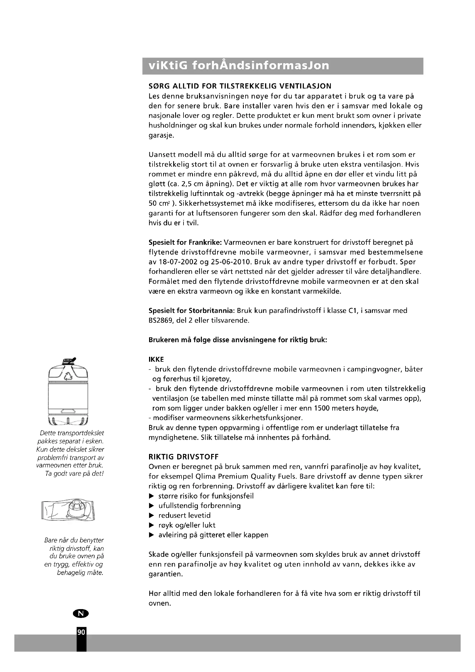 ). Sikkerhetssystemet må ikke modifiseres, ettersom du da ikke har noen garanti for at luftsensoren fungerer som den skal. Rådfør deg med forhandleren hvis du er i tvil. Spesielt for Frankrike: Varmeovnen er bare konstruert for drivstoff beregnet på flytende drivstoffdrevne mobile varmeovner, i samsvar med bestemmelsene av 18-07-2002 og 25-06-2010. Bruk av andre typer drivstoff er forbudt. Spør forhandleren eller se vårt nettsted når det gjelder adresser til våre detaljhandlere. Formålet med den flytende drivstoffdrevne mobile varmeovnen er at den skal være en ekstra varmeovn og ikke en konstant varmekilde. Spesielt for Storbritannia: Bruk kun parafindrivstoff i klasse C1, i samsvar med BS2869, del 2 eller tilsvarende. Brukeren må følge disse anvisningene for riktig bruk: IKKE - bruk den flytende drivstoffdrevne mobile varmeovnen i campingvogner, båter og førerhus til kjøretøy, - bruk den flytende drivstoffdrevne mobile varmeovnen i rom uten tilstrekkelig ventilasjon (se tabellen med minste tillatte mål på rommet som skal varmes opp), rom som ligger under bakken og/eller i mer enn 1500 meters høyde, - modifiser varmeovnens sikkerhetsfunksjoner. Bruk av denne typen oppvarming i offentlige rom er underlagt tillatelse fra myndighetene. Slik tillatelse må innhentes på forhånd. RIKTIG DRIVSTOFF Ovnen er beregnet på bruk sammen med ren, vannfri parafinolje av høy kvalitet, for eksempel Qlima Premium Quality Fuels. Bare drivstoff av denne typen sikrer riktig og ren forbrenning. Drivstoff av dårligere kvalitet kan føre til: E større risiko for funksjonsfeil E ufullstendig forbrenning E redusert levetid E røyk og/eller lukt E avleiring på gitteret eller kappen Skade og/eller funksjonsfeil på varmeovnen som skyldes bruk av annet drivstoff enn ren parafinolje av høy kvalitet og uten innhold av vann, dekkes ikke av garantien. Hør alltid med den lokale forhandleren for å få vite hva som er riktig drivstoff til ovnen.