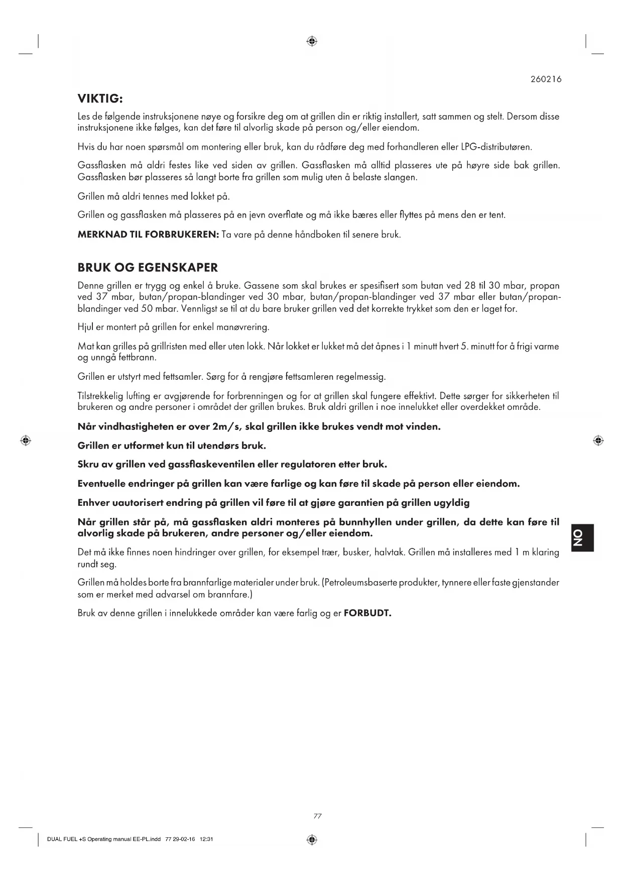 VIKTIG: Les de følgende instruksjonene nøye og forsikre deg om at grillen din er riktig installert, satt sammen og stelt. Dersom disse instruksjonene ikke følges, kan det føre til alvorlig skade på person og/eller eiendom. Hvis du har noen spørsmål om montering eller bruk, kan du rådføre deg med forhandleren eller LPG-distributøren. Gassflasken må aldri festes like ved siden av grillen. Gassflasken må alltid plasseres ute på høyre side bak grillen. Gassflasken bør plasseres så langt borte fra grillen som mulig uten å belaste slangen. Grillen må aldri tennes med lokket på. Grillen og gassflasken må plasseres på en jevn overflate og må ikke bæres eller flyttes på mens den er tent. MERKNAD TIL FORBRUKEREN: Ta vare på denne håndboken til senere bruk.