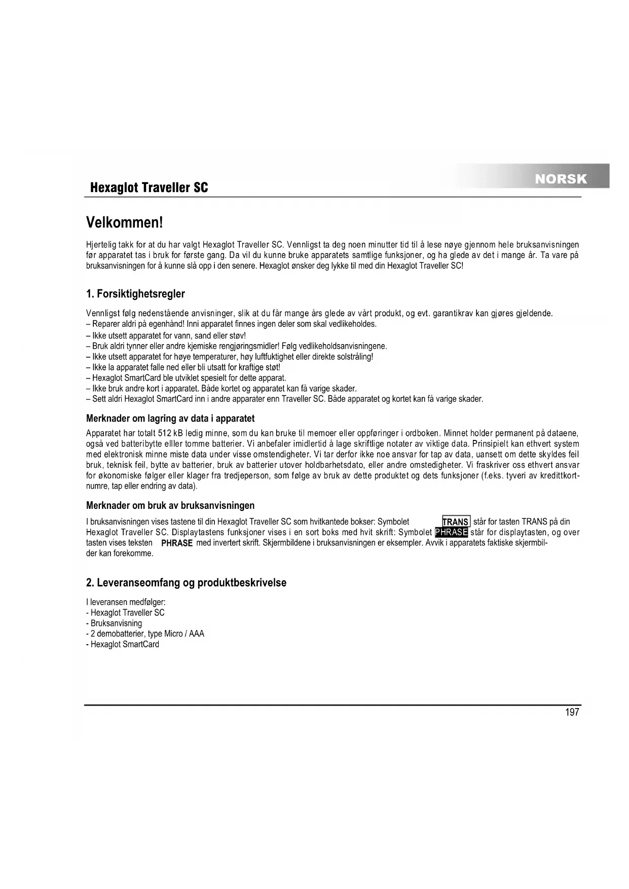 Vennligst følg nedenstående anvisninger, slik at du får mange års glede av vårt produkt, og evt. garantikrav kan gjøres gjeldende. – Reparer aldri på egenhånd! Inni apparatet finnes ingen deler som skal vedlikeholdes. – Ikke utsett apparatet for vann, sand eller støv! – Bruk aldri tynner eller andre kjemiske rengjøringsmidler! Følg vedlikeholdsanvisningene. – Ikke utsett apparatet for høye temperaturer, høy luftfuktighet eller direkte solstråling! – Ikke la apparatet falle ned eller bli utsatt for kraftige støt! – Hexaglot SmartCard ble utviklet spesielt for dette apparat. – Ikke bruk andre kort i apparatet. Både kortet og apparatet kan få varige skader. – Sett aldri Hexaglot SmartCard inn i andre apparater enn Traveller SC. Både apparatet og kortet kan få varige skader. Merknader om lagring av data i apparatet Apparatet har totalt 512 kB ledig minne, som du kan bruke til memoer eller oppføringer i ordboken. Minnet holder permanent på dataene, også ved batteribytte elller tomme batterier. Vi anbefaler imidlertid å lage skriftlige notater av viktige data. Prinsipielt kan ethvert system med elektronisk minne miste data under visse omstendigheter. Vi tar derfor ikke noe ansvar for tap av data, uansett om dette skyldes feil bruk, teknisk feil, bytte av batterier, bruk av batterier utover holdbarhetsdato, eller andre omstedigheter. Vi fraskriver oss ethvert ansvar for økonomiske følger eller klager fra tredjeperson, som følge av bruk av dette produktet og dets funksjoner (f.eks. tyveri av kredittkort- numre, tap eller endring av data). Merknader om bruk av bruksanvisningen I bruksanvisningen vises tastene til din Hexaglot Traveller SC som hvitkantede bokser: Symbolet TRANS står for tasten TRANS på din Hexaglot Traveller SC. Displaytastens funksjoner vises i en sort boks med hvit skrift: Symbolet PHRASE står for displaytasten, og over tasten vises teksten PHRASE med invertert skrift. Skjermbildene i bruksanvisningen er eksempler. Avvik i apparatets faktiske skjermbil- der kan forekomme.