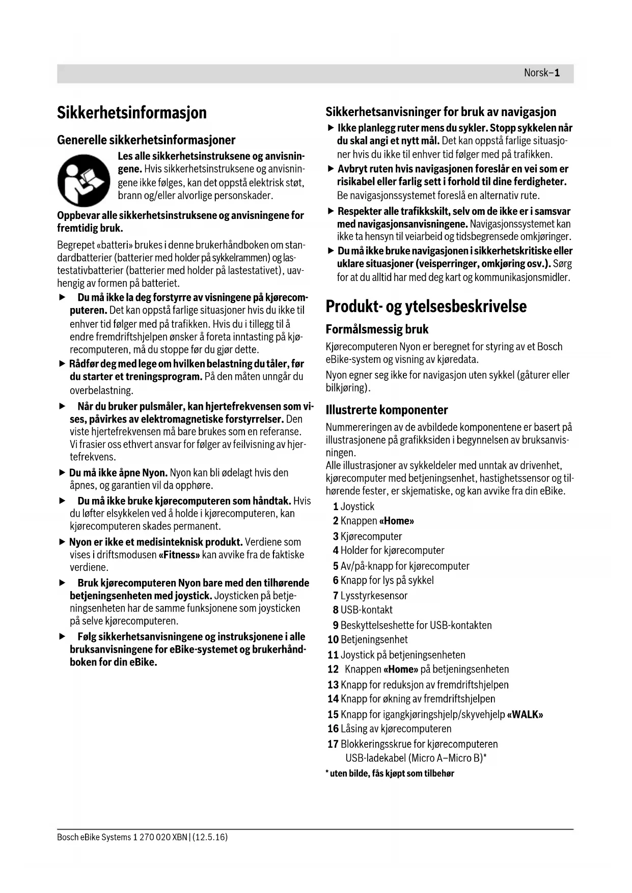 Feil ved lader Skift ut laderen. Kontakt din Bosch eBike-forhandler. Kode Årsak UtbedringNorsk–11 Bosch eBike Systems 1 270 020 XBN | (12.5.16) Energitilførsel til eksterne apparater via USB-port Ved hjelp av USB-porten kan de fleste apparatene med mulig energitilførsel via USB (f.eks. diverse mobiltelefoner) brukes hhv. lades opp. For at ladingen skal fungere, må kjørecomputeren og et til- strekkelig ladet batteri være montert på eBike. Åpne beskyttelsesdekselet 9 til USB-tilkoblingen på kjørecom- puteren. Koble den eksterne enhetens USB-tilkobling til USB- kontakten 8 på kjørecomputeren ved bruk av USB-ladekabelen Micro A –Micro B (føres av din Bosch eBike-forhandler). Etter frakobling av forbrukeren må USB-tilkoblingen lukkes med beskyttelsesdekselet 9 igjen. En USB-forbindelse er ingen vanntett pluggforbindel- se. Ved sykling i regn må ingen eksterne enheter ko- bles til, og USB-tilkoblingen må lukkes helt med be- skyttelsesdekselet 9. Obs! Forbrukere som er koblet til Nyon, kan påvirke elsykke- lens rekkevidde. Henvisninger til sykling med el-sykkel-systemet God bruk av el-sykkelen Pass på riktig drifts- og lagringstemperatur for eBike-kompo- nentene. Beskytt drivenheten, kjørecomputeren og batteriet mot ekstreme temperaturer (f.eks. sterkt sollys uten samtidig ventilasjon). Komponenten (spesielt batteriet) kan skades av ekstreme temperaturer. Sørg for at skjermen til Nyon alltid er ren. Skitt kan føre til feil ved registreringen av lysstyrken. I navigasjonsmodus kan det oppstå feil ved dag/natt-omkoblingen. Ved brå endring av omgivelsesforholdene kan det oppstå kon- dens på innsiden av glasset. Det skjer en temperaturutligning etter kort tid, og kondensen forsvinner. Service og vedlikehold Vedlikehold og rengjøring Ingen komponenter må senkes ned i vann eller rengjøres med høytrykksspyler. Dette gjelder også drivenheten. Kjørecomputeren må bare rengjøres med en myk klut fuktet med vann. Bruk ikke rengjøringsmidler. Få inspisert eBike-systemet teknisk minst en gang i året (f.eks. mekanisk og om systemprogramvaren er oppdatert). Sykkelprodusenten eller -forhandleren kan også legge kjøre- lengde og/eller tidsrom til grunn for servicetidspunktet. Da vil kjørecomputeren vise servicetidspunktet i fire sekunder hver gang den slås på. Til service og reparasjon av el-sykkelen henvender du deg til en autorisert sykkel-forhandler. Få utført alle reparasjoner hos en autorisert sykkelfor- handler. Kundeservice og rådgivning ved bruk Ved alle spørsmål til el-sykkel-systemet og dets komponen- ter, ta kontakt med en autorisert sykkelforhandler. Kontaktinformasjoner til autoriserte sykkelforhandlere finner du på internettsiden www.bosch-ebike.com Transport Hvis du transporterer eBike utenfor bilen, for eksem- pel på et sykkelstativ, må du ta av kjørecomputeren og PowerPack, slik at du unngå skader på disse.