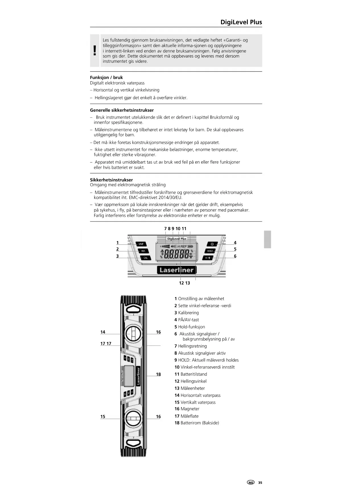 Funksjon / bruk Digitalt elektronisk vaterpass – Horisontal og vertikal vinkelvisning – Hellingslageret gjør det enkelt å overføre vinkler. Generelle sikkerhetsinstrukser – Bruk instrumentet utelukkende slik det er denert i kapittel Bruksformål og innenfor spesikasjonene. – Måleinstrumentene og tilbehøret er intet leketøy for barn. De skal oppbevares utilgjengelig for barn. – Det må ikke foretas konstruksjonsmessige endringer på apparatet. – Ikke utsett instrumentet for mekaniske belastninger, enorme temperaturer, fuktighet eller sterke vibrasjoner. – Apparatet må umiddelbart tas ut av bruk ved feil på en eller ere funksjoner eller hvis batteriet er svakt. Sikkerhetsinstrukser Omgang med elektromagnetisk stråling – Måleinstrumentet tilfredsstiller forskriftene og grenseverdiene for elektromagnetisk kompatibilitet iht. EMC-direktivet 2014/30/EU. – Vær oppmerksom på lokale innskrenkninger når det gjelder drift, eksempelvis på sykehus, i y, på bensinstasjoner eller i nærheten av personer med pacemaker. Farlig interferens eller forstyrrelse av elektroniske enheter er mulig. DigiLevel Plus