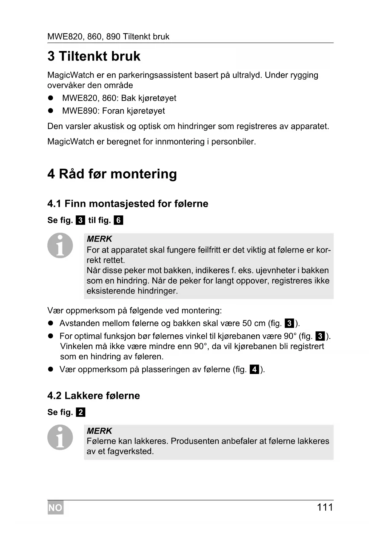 3 Tiltenkt bruk MagicWatch er en parkeringsassistent basert på ultralyd. Under rygging overvåker den område MWE820, 860: Bak kjøretøyet MWE890: Foran kjøretøyet Den varsler akustisk og optisk om hindringer som registreres av apparatet. MagicWatch er beregnet for innmontering i personbiler. 4 Råd før montering