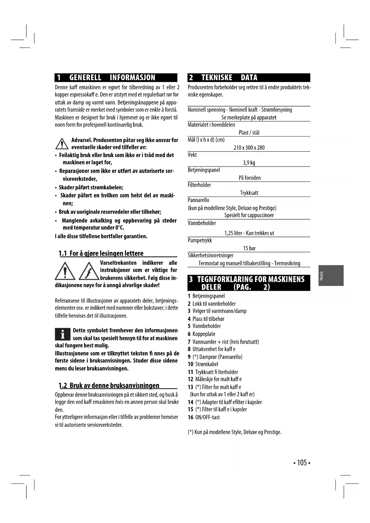 DELER (PAG. 2) 1 Betjeningspanel 2 Lokk til vannbeholder 3 Velger til varmtvann/damp 4 Plass til tilbehør 5 Vannbeholder 6 Koppeplate 7 Vannsamler + rist (hvis forutsatt) 8 Uttaksenhet for ka e 9 (*) Damprør (Pannarello) 10 Strømkabel 11 Trykksatt lterholder 12 Måleskje for malt ka e 13 (*) Filter for malt ka e (kun for uttak av 1 eller 2 ka er) 14 (*) Adapter til ka e lter i kapsler 15 (*) Filter til ka e i kapsler 16 ON/OFF-tast (*) Kun på modellene Style, Deluxe og Prestige.• 106 • 17 Kontrollampe "påslått maskin" Tent = påslått maskin Slukket = maskin er avslått 18 Bryter for ka euttak 19 Kontrollampe ka e/vann - "maskinen er klar" Tent= OK, maskinen er klar for uttak av ka e/varmt vann. Slukket = Lav temperatur for ka e/varmt vann. 20 Dampbryter 21 Kontrollampe " klar for damp" Tent = OK, maskinen er klar for uttak av damp. Slukket = Lav temperatur for damp. 4 INSTALLASJON For din egen og andres sikkerhet må du alltid ta hensyn til instruksjonene i kapittel 3 som gjelder "Sikkerhets- normer".