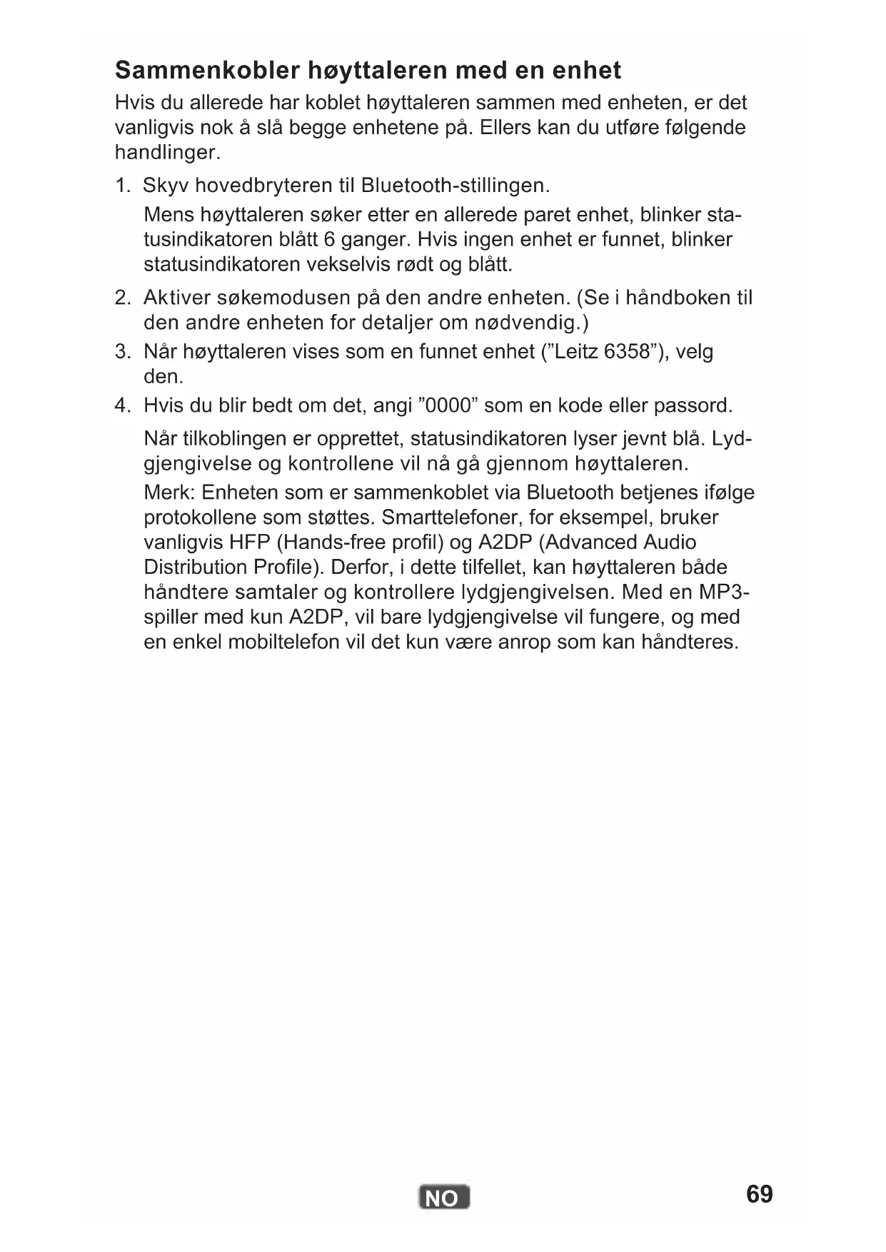Når tilkoblingen er opprettet, statusindikatoren lyser jevnt blå. Lyd- gjengivelse og kontrollene vil nå gå gjennom høyttaleren. Merk: Enheten som er sammenkoblet via Bluetooth betjenes ifølge protokollene som støttes. Smarttelefoner, for eksempel, bruker vanligvis HFP (Hands-free prol) og A2DP (Advanced Audio Distribution Prole). Derfor, i dette tilfellet, kan høyttaleren både håndtere samtaler og kontrollere lydgjengivelsen. Med en MP3- spiller med kun A2DP, vil bare lydgjengivelse vil fungere, og med en enkel mobiltelefon vil det kun være anrop som kan håndteres.70