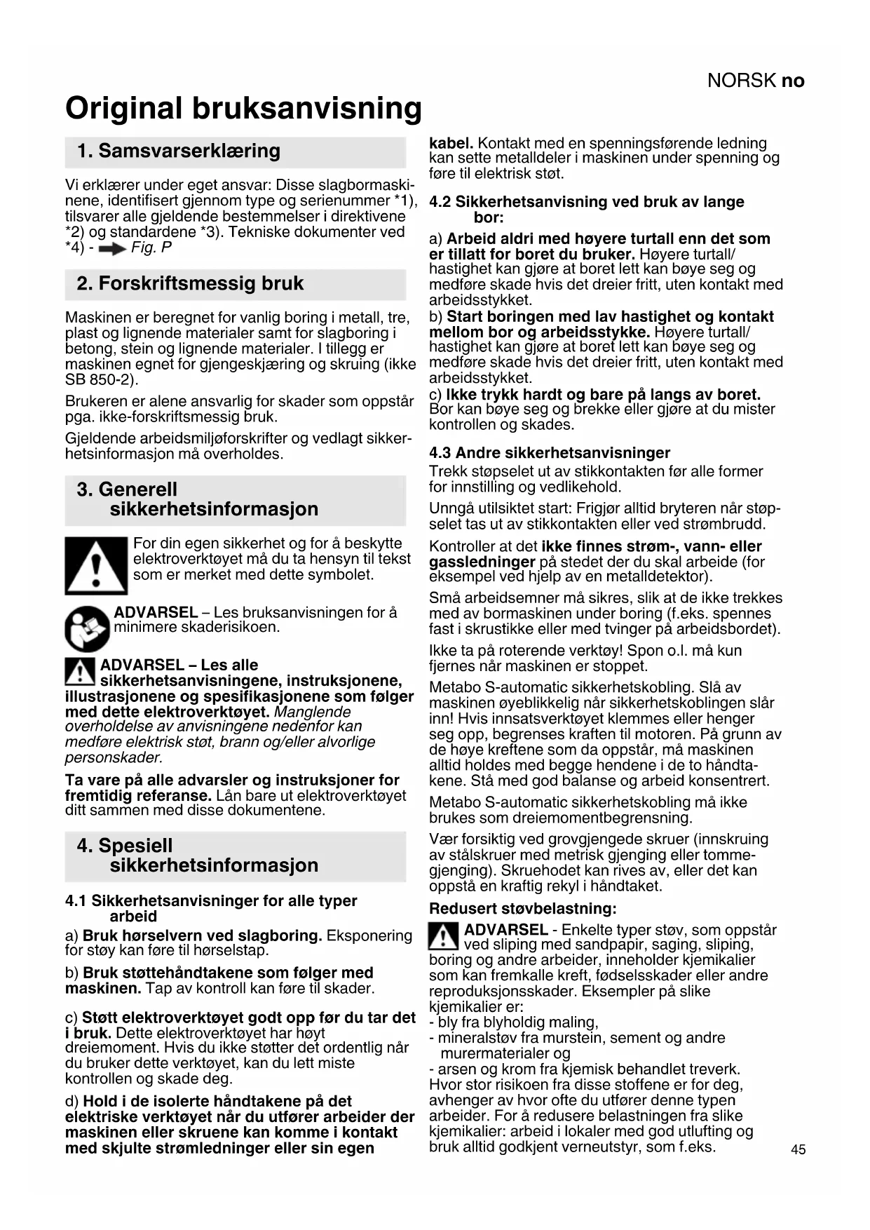Metabo S-automatic sikkerhetskobling. Slå av maskinen øyeblikkelig når sikkerhetskoblingen slår inn! Hvis innsatsverktøyet klemmes eller henger seg opp, begrenses kraften til motoren. På grunn av de høye kreftene som da oppstår, må maskinen alltid holdes med begge hendene i de to håndtakene. Stå med god balanse og arbeid konsentrert.
