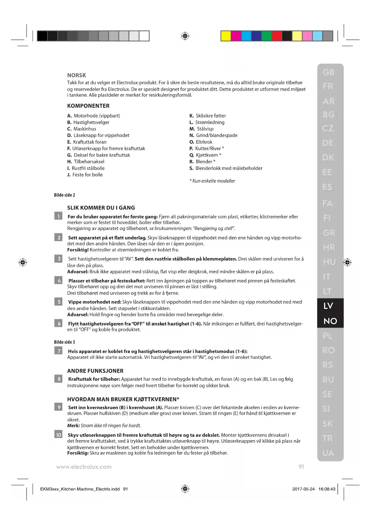 17 Koble fra produktet. Ballongvispen, kjøttkvernen* og skjære-/rivemaskinen* skal kun vaskes for hånd i varmt såpevann. Bollen, atvispen og deigkroken kan settes i oppvaskmaskinen. Bare plasser deler på øverste hyllen hvis du bruker en oppvaskmaskin. Forsiktig! Knivbladene og innsatsene er meget skarpe og kan forårsake skade. Advarsel! Aldri senk hoveddelen, pluggen eller ledningen i vann eller annen væske. Tørk hver del grundig før bruk. 18 Rengjøring av blenderen*: Roter blenderen mot urviseren og ta den av. Ta av lokket. Hell ut blandingen fra blenderen. Tilsett en dråpe op- pvaskmiddel og en liter varmt vann. Fest blenderen på apparatet. Kjør maskinen på hastighet 6 i et halvt minutt, og hell ut vannet. Skyll blenderen og la den tørke. Forsiktig! Knivbladene og innsatsene er meget skarpe og kan forårsake skade. 19 Hoveddelen bør bare rengjøres med en fuktig klut, og deretter tørkes med en klut. Merk: Ikke bruk skuremidler eller skuresvamper for å rengjøre overatene på apparatet. Nyt ditt nye Electrolux-produkt! EKM3xxx_Kitchen Machine_Electrlx.indd 92 2017-05-24 16:08:4393 www.electrolux.com