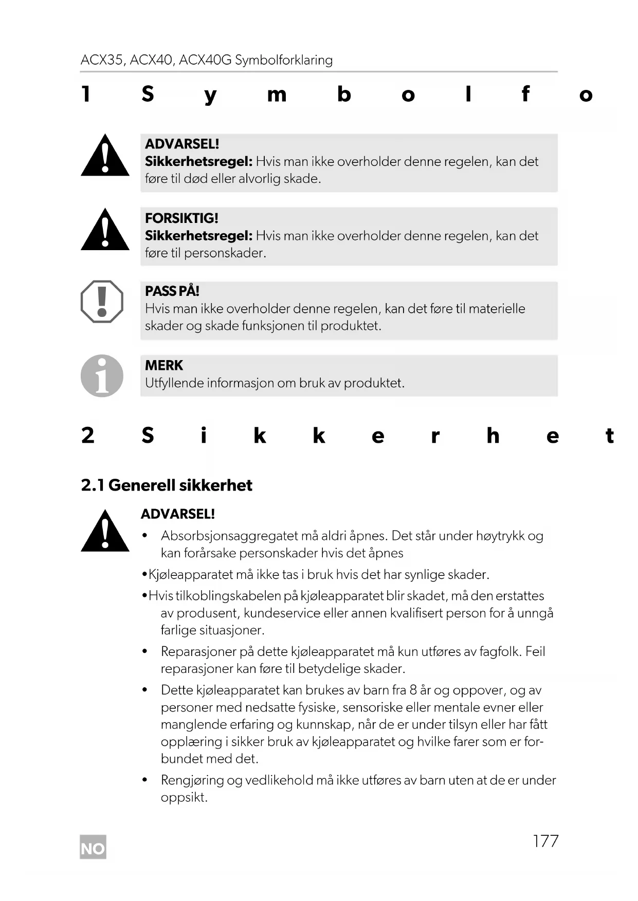 - Pass på at kjøleapparatet får tilstrekkelig lufting, slik at varmen som trekkes inn kan ledes bort, hvis ikke er ikke feilfri funksjon garantert. Pass spesielt på at lufteåpningene ikke tildekkes. ACX35-ACX40-ACX40G-O-15s.book Seite 183 Freitag, 22. September 2017 6:24 18NO Betjening ACX35, ACX40, ACX40G
