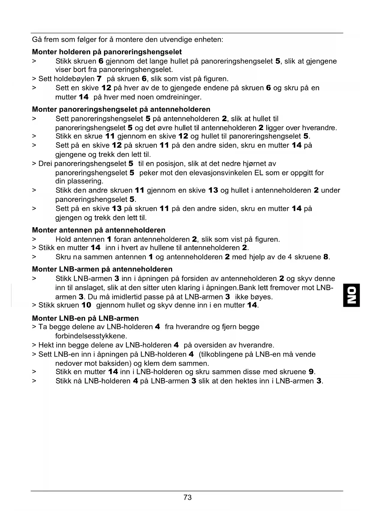 6 11/12/14 2 10 3 9/1412 5 14 11/13/14 Pos. Ant. Artikkel 1 1 Antenne 2 1 Antenneholder 3 1 LNB-arm 4 1 LNB-holder 5 1 Panoreringshengsel 6 1 Skrue U-form 7 1 Holdebøyle 8 4 Skrue M6 x 12 krysslisse 9 1 Skrue M6 x 16 indre sekskant 10 1 Skrue M6 x 35 indre sekskant 11 2 Skrue M6 x 65 sekskant 12 4 Underlagskive M6 x 12 13 2 Underlagskive M6 x 17 14 10 Mutter M6 sekskant 1 Monteringsanvisning 72Gå frem som følger for å montere den utvendige enheten: Monter holderen på panoreringshengselet > Stikk skruen 6 gjennom det lange hullet på panoreringshengselet 5, slik at gjengene viser bort fra panoreringshengselet. > Sett holdebøylen 7 på skruen 6, slik som vist på figuren. > Sett en skive 12 på hver av de to gjengede endene på skruen 6 og skru på en mutter 14 på hver med noen omdreininger. Monter panoreringshengselet på antenneholderen > Sett panoreringshengselet 5 på antenneholderen 2, slik at hullet til panoreringshengselet 5 og det øvre hullet til antenneholderen 2 ligger over hverandre. > Stikk en skrue 11 gjennom en skive 12 og hullet til panoreringshengselet 5. > Sett på en skive 12 på skruen 11 på den andre siden, skru en mutter 14 på gjengene og trekk den lett til. > Drei panoreringshengselet 5 til en posisjon, slik at det nedre hjørnet av panoreringshengselet 5 peker mot den elevasjonsvinkelen EL som er oppgitt for din plassering. > Stikk den andre skruen 11 gjennom en skive 13 og hullet i antenneholderen 2 under panoreringshengselet 5. > Sett på en skive 13 på skruen 11 på den andre siden, skru en mutter 14 på gjengen og trekk den lett til. Monter antennen på antenneholderen > Hold antennen 1 foran antenneholderen 2, slik som vist på figuren. > Stikk en mutter 14 inn i hvert av hullene til antenneholderen 2. > Skru na sammen antennen 1 og antenneholderen 2 med hjelp av de 4 skruene 8. Monter LNB-armen på antenneholderen > Stikk LNB-armen 3 inn i åpningen på forsiden av antenneholderen 2 og skyv denne inn til anslaget, slik at den sitter uten klaring i åpningen.Bank lett fremover mot LNB- armen 3. Du må imidlertid passe på at LNB-armen 3 ikke bøyes. > Stikk skruen 10 gjennom hullet og skyv denne inn i en mutter 14. Monter LNB-en på LNB-armen > Ta begge delene av LNB-holderen 4 fra hverandre og fjern begge forbindelsesstykkene. > Hekt inn begge delene av LNB-holderen 4 på oversiden av hverandre. > Sett LNB-en inn i åpningen på LNB-holderen 4 (tilkoblingene på LNB-en må vende nedover mot baksiden) og klem dem sammen. > Stikk en mutter 14 inn i LNB-holderen og skru sammen disse med skruene 9. > Stikk nå LNB-holderen 4 på LNB-armen 3 slik at den hektes inn i LNB-armen 3.