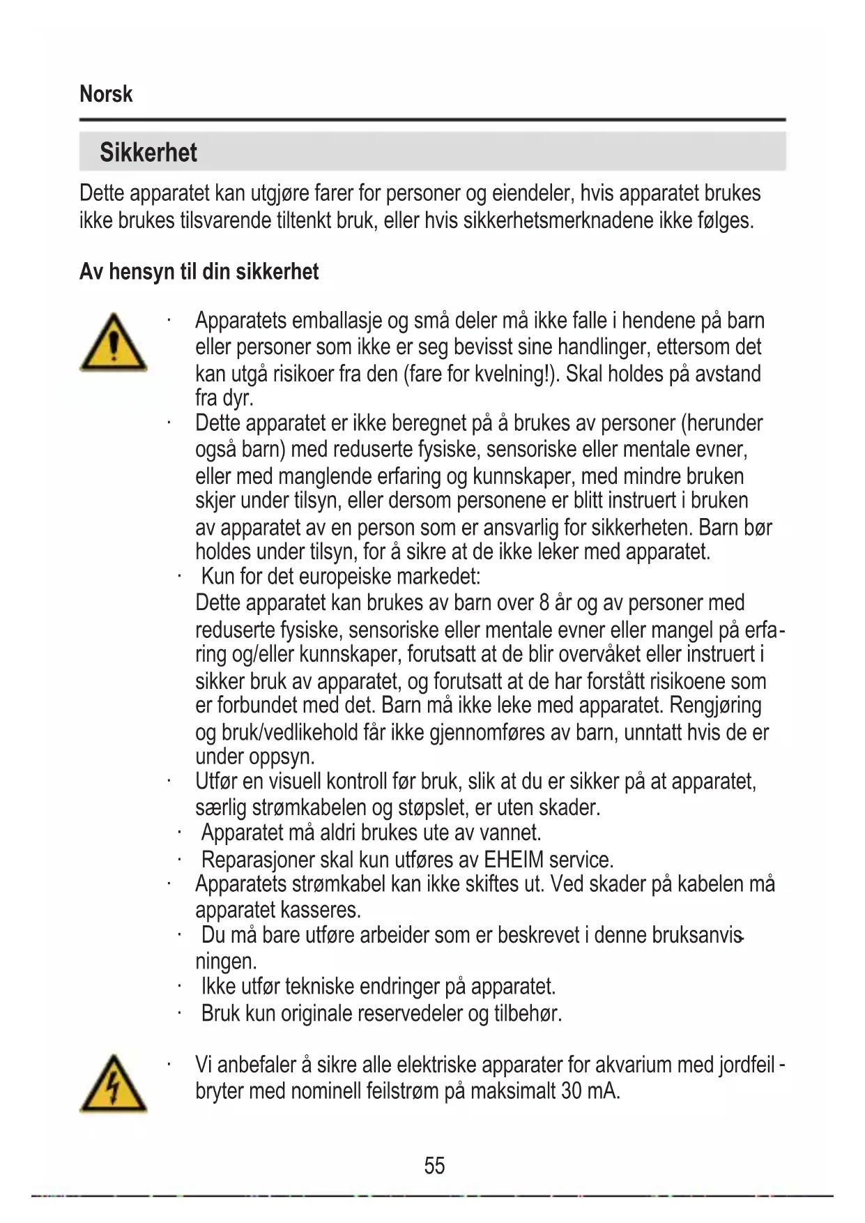 ring og/eller kunnskaper, forutsatt at de blir overvåket eller instruert i sikker bruk av apparatet, og forutsatt at de har forstått risikoene som er forbundet med det. Barn må ikke leke med apparatet. Rengjøring og bruk/vedlikehold får ikke gjennomføres av barn, unntatt hvis de er under oppsyn. ‧ Utfør en visuell kontroll før bruk, slik at du er sikker på at apparatet, særlig strømkabelen og støpslet, er uten skader. ‧ Apparatet må aldri brukes ute av vannet. ‧ Reparasjoner skal kun utføres av EHEIM service. ‧ Apparatets strømkabel kan ikke skiftes ut. Ved skader på kabelen må apparatet kasseres. ‧ Du må bare utføre arbeider som er beskrevet i denne bruksanvis