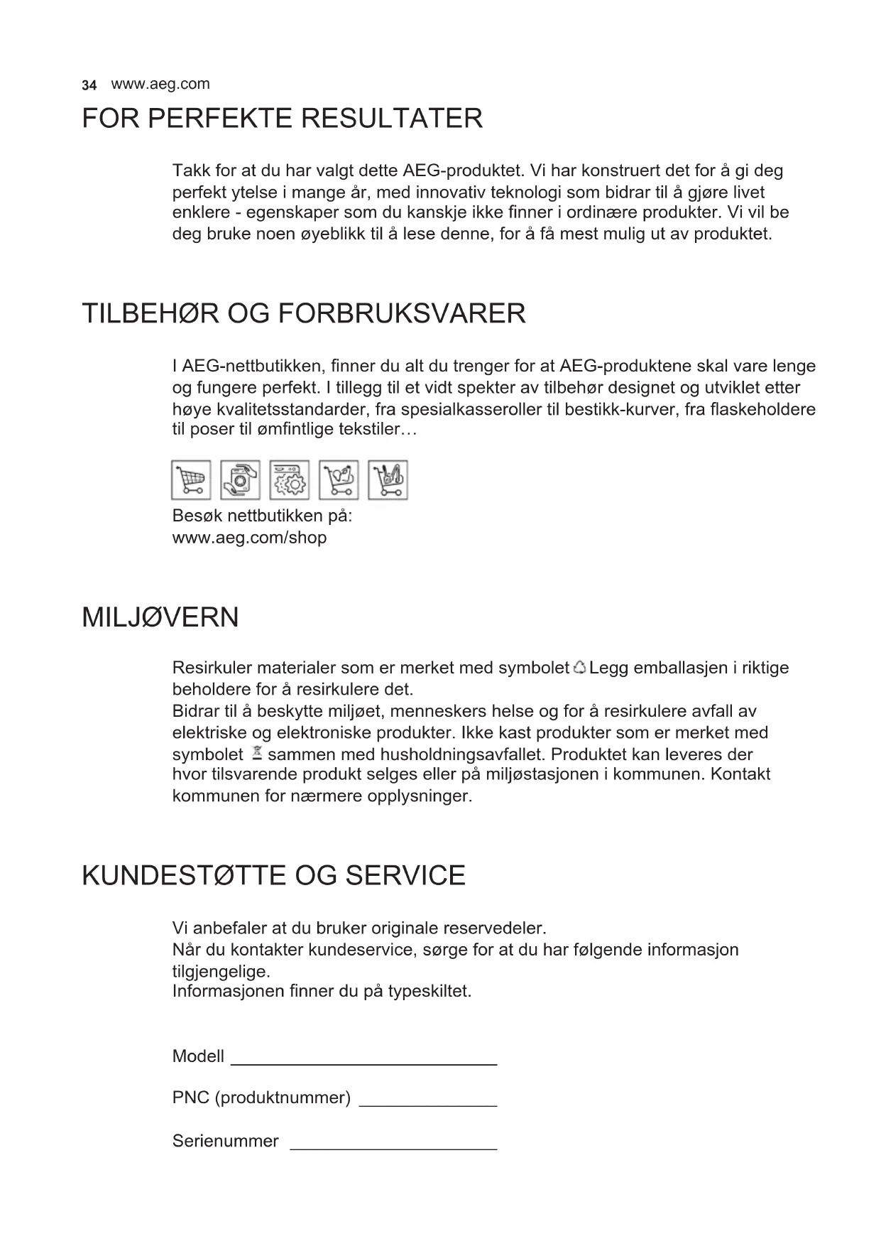 I AEG-nettbutikken, nner du alt du trenger for at AEG-produktene skal vare lenge og fungere perfekt. I tillegg til et vidt spekter av tilbehør designet og utviklet etter høye kvalitetsstandarder, fra spesialkasseroller til bestikk-kurver, fra askeholdere til poser til ømntlige tekstiler… Besøk nettbutikken på: www.aeg.com/shop MILJØVERN Resirkuler materialer som er merket med symbolet . Legg emballasjen i riktige beholdere for å resirkulere det. Bidrar til å beskytte miljøet, menneskers helse og for å resirkulere avfall av elektriske og elektroniske produkter. Ikke kast produkter som er merket med symbolet sammen med husholdningsavfallet. Produktet kan leveres der hvor tilsvarende produkt selges eller på miljøstasjonen i kommunen. Kontakt kommunen for nærmere opplysninger.