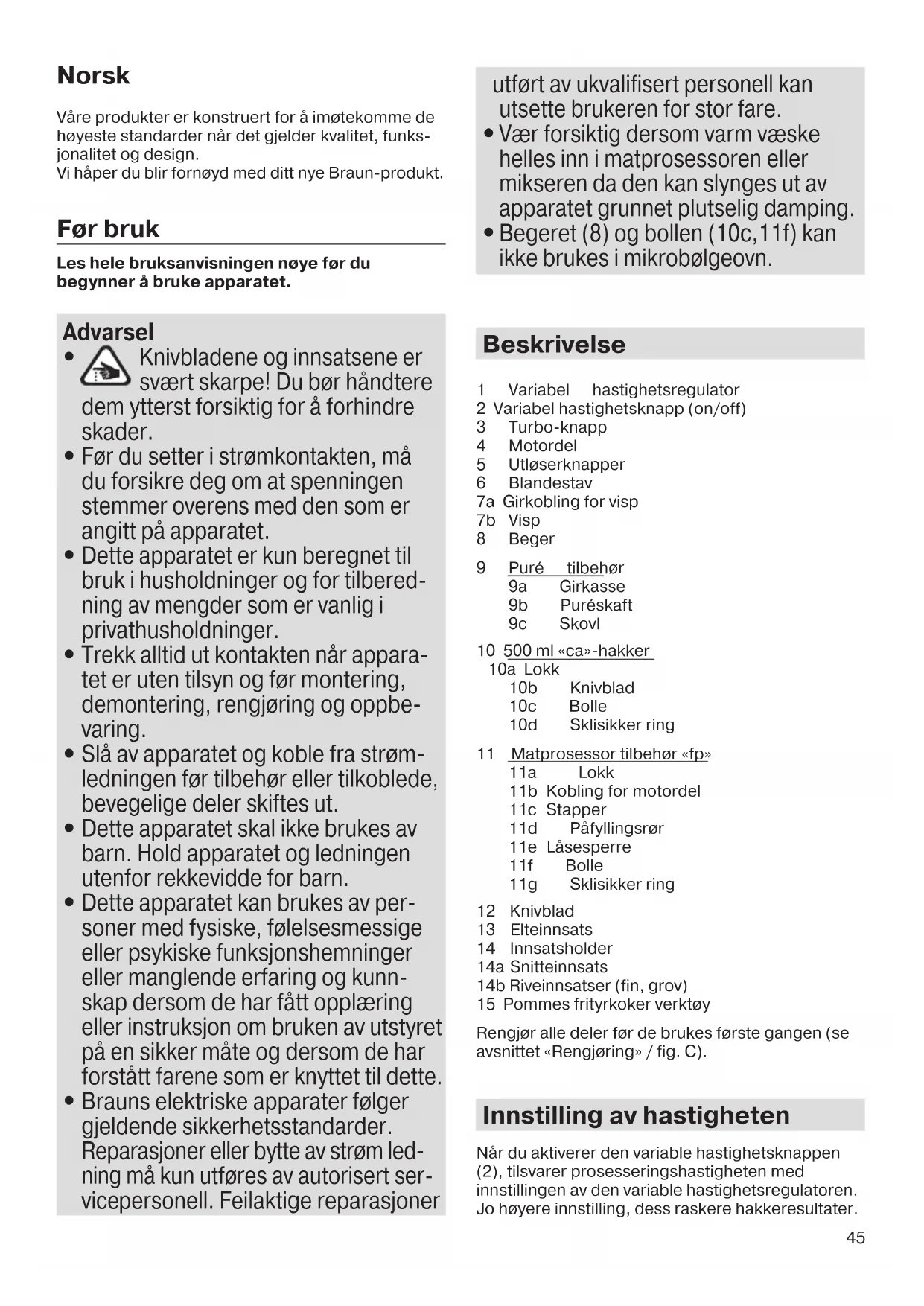 Brauns elektriske apparater følger gjeldende sikkerhetsstandarder. Reparasjoner eller bytte av strøm led- ning må kun utføres av autorisert ser- vice personell. Feilaktige reparasjoner utført av ukvalifisert personell kan utsette brukeren for stor fare.