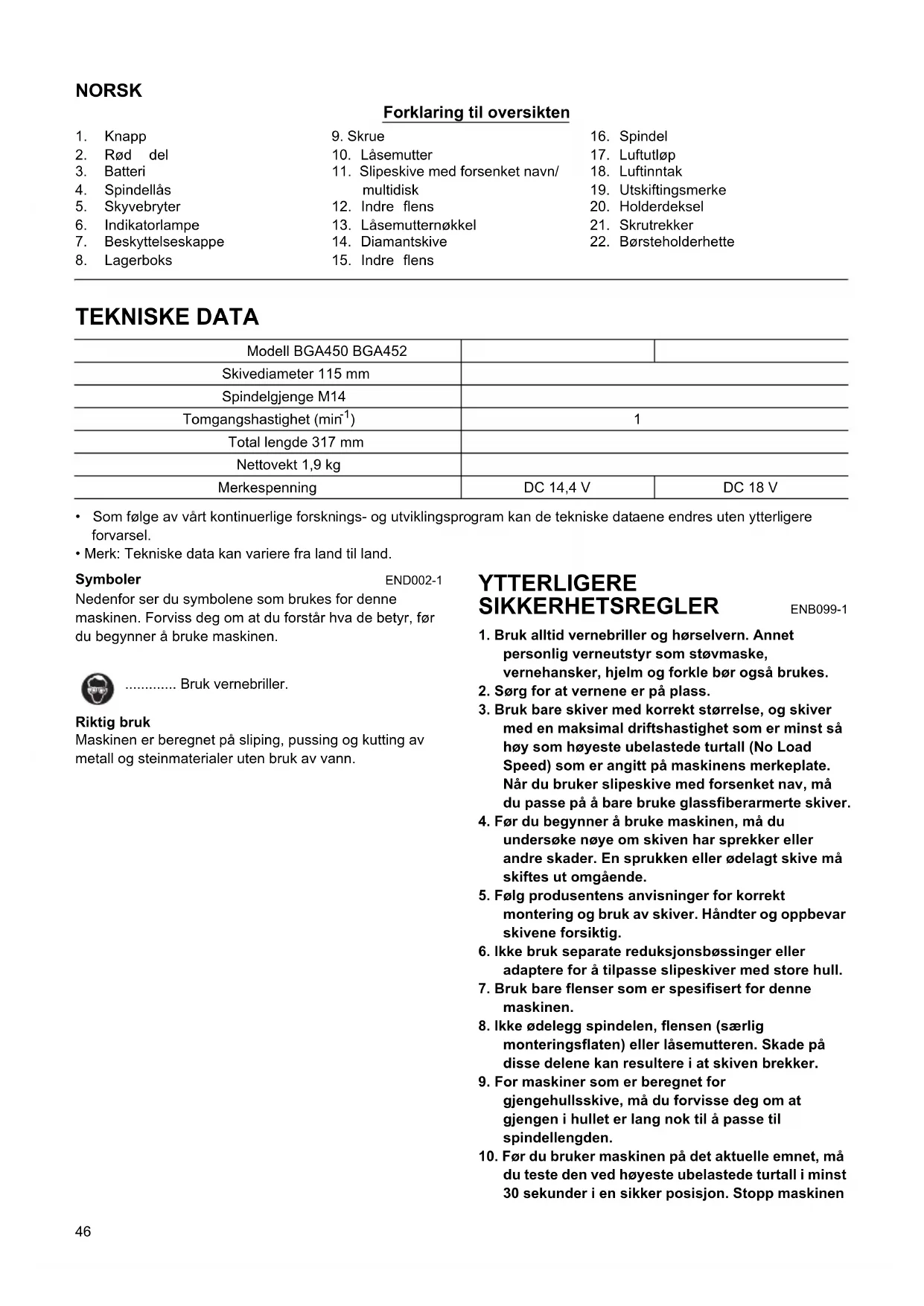 - Merk: Tekniske data kan variere fra land til land. Symboler END002-1 Nedenfor ser du symbolene som brukes for denne maskinen. Forviss deg om at du forstår hva de betyr, før du begynner å bruke maskinen. ............. Bruk vernebriller. Riktig bruk Maskinen er beregnet på sliping, pussing og kutting av metall og steinmaterialer uten bruk av vann. YTTERLIGERE SIKKERHETSREGLER ENB099-1