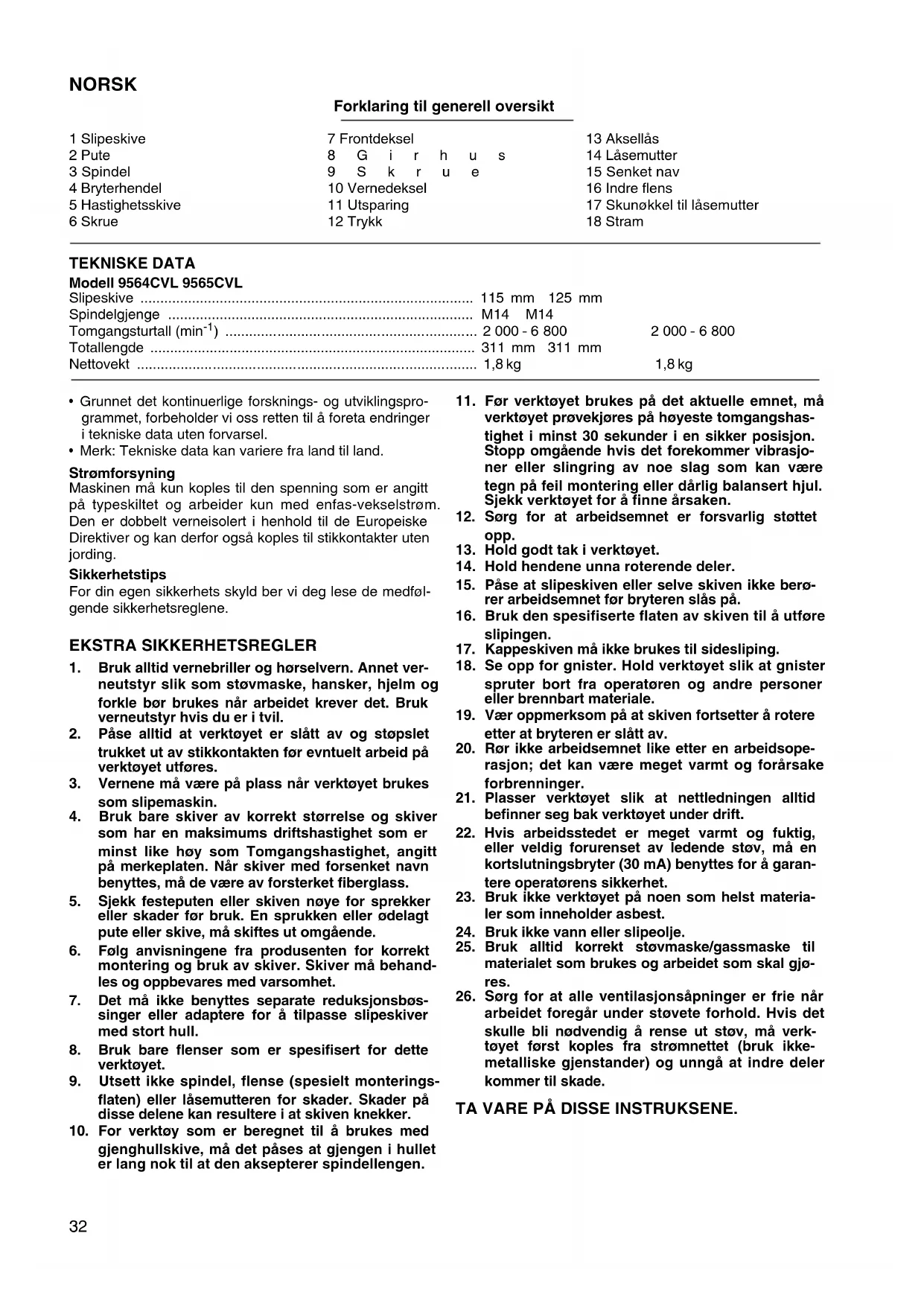 - Kontinuerlig bruk av en slitt skive kan resultere i at ski- ven eksploderer med alvorlig personskade til følge. SERVICE NB! Før servicearbeider utføres på maskinen må det passes på at denne er slått av og at støpselet er trukket ut av stikkontakten. Reparasjon og vedlikehold Selve verktøyet og åpningsventilene for luftavkjøling må alltid holdes rene. Når fremmedlegemer (støv etc.) tren- ger inn de nevnte stedene, må de fjernes. Rengjør med jevne mellomrom alt etter støvmengden. Hvis vernedekslet er montert på maskinen, fjernes det ved å følge “Demontering av vernedeksel”. For å garantere at maskinen arbeider sikkert og pålitelig bør reparasjoner, servicearbeider eller innstillinger utfø- res av et autorisert Makita-serviceverksted.35 SUOMI Yleisselostus 1 Hiomalaikka 2 Laippa 3 Kara 4Kytkin 5 Nopeudensäätökehä 6 Ruuvi 7 Kärkisuojus 8 Vaihdekotelo 9 Ruuvi 10 Laikan suojus 11 Kolo 12 Paina 13 Karalukitus 14 Lukkomutteri 15 Keskeltä ohennettu laikka 16 Sisälaippa 17 Lukkomutteriavain 18 Kiristyy TEKNISET TIEDOT Malli 9564CVL 9565CVL Hiomalaikka ................................................................................. 115 mm 125 mm Karan kierre ................................................................................. M14 M14 Tyhjäkäyntikierrosluku (min