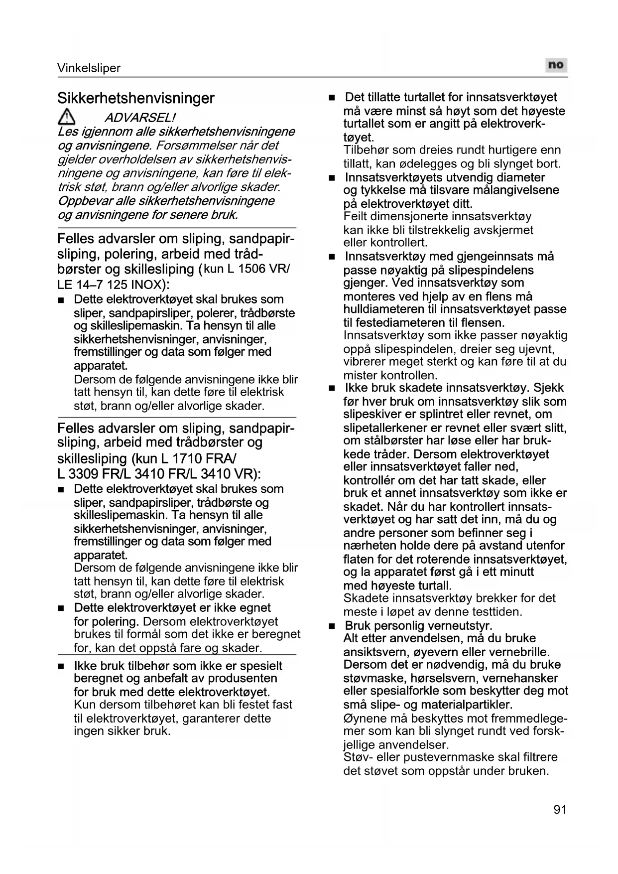 Sikkerhetshenvisninger ADVARSEL! Les igjennom alle sikkerhetshenvisningene og anvisningene. Forsømmelser når det gjelder overholdelsen av sikkerhetshenvis- ningene og anvisningene, kan føre til elek- trisk støt, brann og/eller alvorlige skader. Oppbevar alle sikkerhetshenvisningene og anvisningene for senere bruk. Felles advarsler om sliping, sandpapir- sliping, polering, arbeid med tråd- børster og skillesliping ( kun L 1506 VR/ LE 14–7 125 INOX):