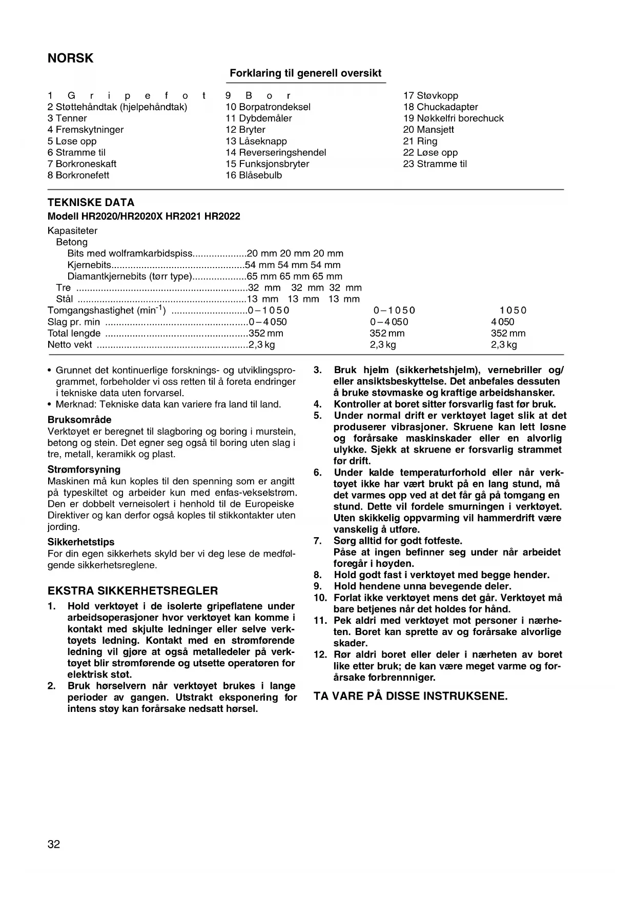 - Merknad: Tekniske data kan variere fra land til land. Bruksområde Verktøyet er beregnet til slagboring og boring i murstein, betong og stein. Det egner seg også til boring uten slag i tre, metall, keramikk og plast. Strømforsyning Maskinen må kun koples til den spenning som er angitt på typeskiltet og arbeider kun med enfas-vekselstrøm. Den er dobbelt verneisolert i henhold til de Europeiske Direktiver og kan derfor også koples til stikkontakter uten jording. Sikkerhetstips For din egen sikkerhets skyld ber vi deg lese de medføl- gende sikkerhetsreglene. EKSTRA SIKKERHETSREGLER