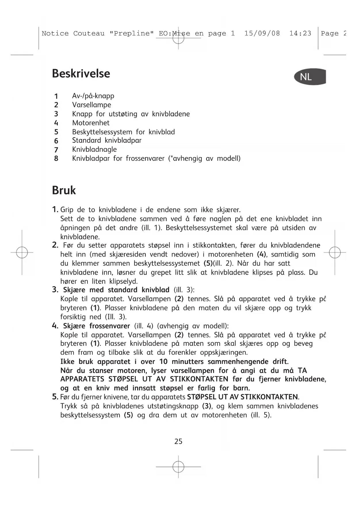 Notice Couteau "Prepline" EO:Mise en page 1 15/09/08 14:23 Page 26I disse tilfellene og for alle andre reparasjoner, ER DET NØDVENDIG å ta kontakt med en godkjent reparatør. Apparatet er beregnet til husholdningsbruk, og skal ikke i noe tilfelle brukes profesjonelt. Profesjonell bruk vil frita oss for alt garantiansvar. Elektrisk eller elektronisk apparat som ikke skal brukes mer
