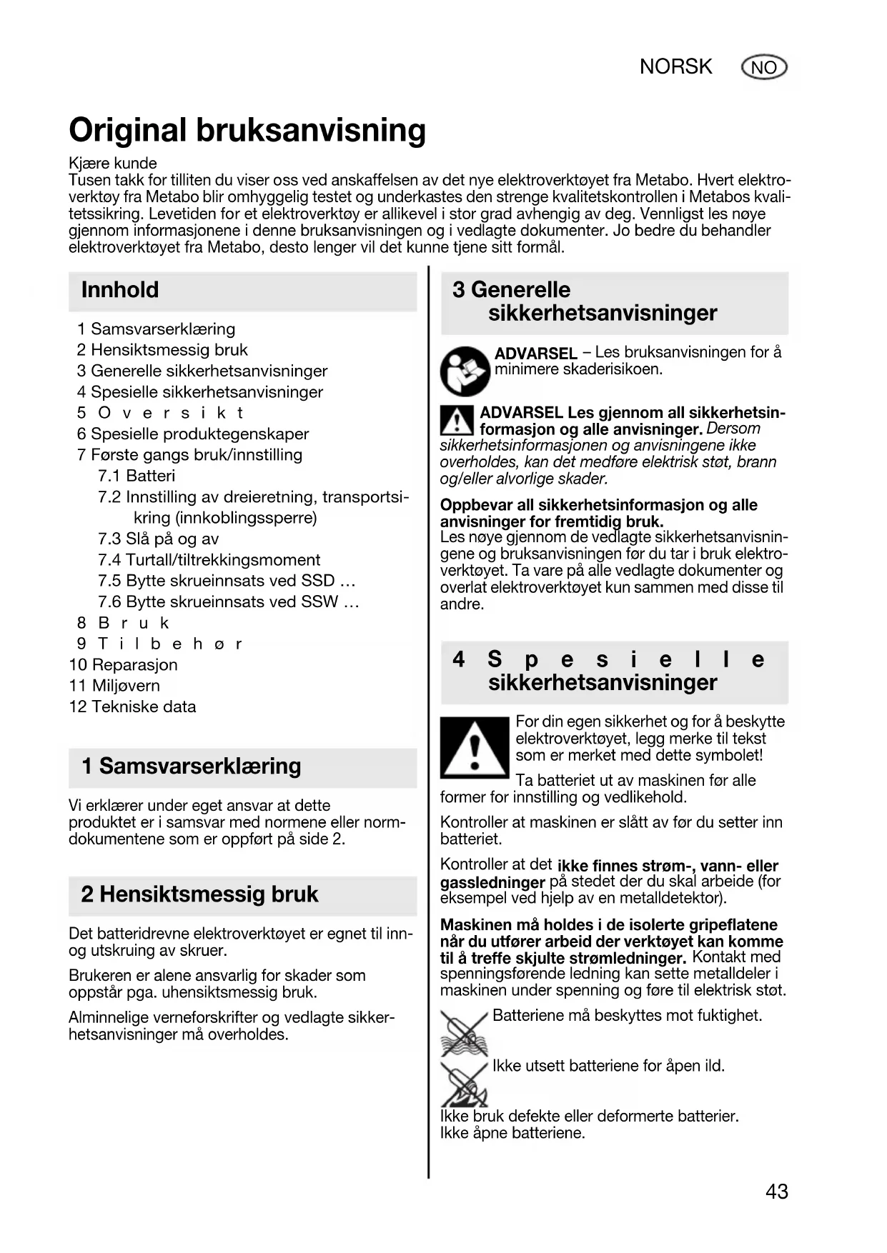 8Bruk 9Tilbehør 10 Reparasjon 11 Miljøvern 12 Tekniske data Vi erklærer under eget ansvar at dette produktet er i samsvar med normene eller norm- dokumentene som er oppført på side 2. Det batteridrevne elektroverktøyet er egnet til inn- og utskruing av skruer. Brukeren er alene ansvarlig for skader som oppstår pga. uhensiktsmessig bruk. Alminnelige verneforskrifter og vedlagte sikker- hetsanvisninger må overholdes. ADVARSEL – Les bruksanvisningen for å minimere skaderisikoen. ADVARSEL Les gjennom all sikkerhetsin- formasjon og alle anvisninger. Dersom sikkerhetsinformasjonen og anvisningene ikke overholdes, kan det medføre elektrisk støt, brann og/eller alvorlige skader. Oppbevar all sikkerhetsinformasjon og alle anvisninger for fremtidig bruk. Les nøye gjennom de vedlagte sikkerhetsanvisnin- gene og bruksanvisningen før du tar i bruk elektro- verktøyet. Ta vare på alle vedlagte dokumenter og overlat elektroverktøyet kun sammen med disse til andre. For din egen sikkerhet og for å beskytte elektroverktøyet, legg merke til tekst som er merket med dette symbolet! Ta batteriet ut av maskinen før alle former for innstilling og vedlikehold. Kontroller at maskinen er slått av før du setter inn batteriet. Kontroller at det ikke finnes strøm-, vann- eller gassledninger på stedet der du skal arbeide (for eksempel ved hjelp av en metalldetektor). Maskinen må holdes i de isolerte gripeflatene når du utfører arbeid der verktøyet kan komme til å treffe skjulte strømledninger. Kontakt med spenningsførende ledning kan sette metalldeler i maskinen under spenning og føre til elektrisk støt. Batteriene må beskyttes mot fuktighet. Ikke utsett batteriene for åpen ild. Ikke bruk defekte eller deformerte batterier. Ikke åpne batteriene. Original bruksanvisning Kjære kunde Tusen takk for tilliten du viser oss ved anskaffelsen av det nye elektroverktøyet fra Metabo. Hvert elektro- verktøy fra Metabo blir omhyggelig testet og underkastes den strenge kvalitetskontrollen i Metabos kvali- tetssikring. Levetiden for et elektroverktøy er allikevel i stor grad avhengig av deg. Vennligst les nøye gjennom informasjonene i denne bruksanvisningen og i vedlagte dokumenter. Jo bedre du behandler elektroverktøyet fra Metabo, desto lenger vil det kunne tjene sitt formål. Innhold 1 Samsvarserklæring 2 Hensiktsmessig bruk 3 Generelle sikkerhetsanvisninger 4Spesielle sikkerhetsanvisninger 17026933_0311 SSW SSD 14_4 18.book Seite 43 Mittwoch, 9. März 2011 1:55 1344 NORSK
