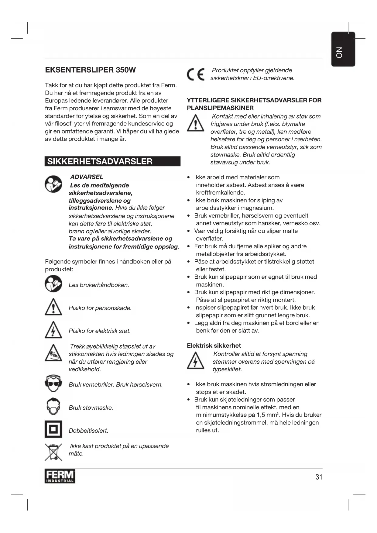 EKSENTERSLIPER 350W Takk for at du har kjøpt dette produktet fra Ferm. Du har nå et fremragende produkt fra en av Europas ledende leverandører. Alle produkter fra Ferm produserer i samsvar med de høyeste standarder for ytelse og sikkerhet. Som en del av vår filosofi yter vi fremragende kundeservice og gir en omfattende garanti. Vi håper du vil ha glede av dette produktet i mange år. SIKKERHETSADVARSLER ADVARSEL Les de medfølgende sikkerhetsadvarslene, tilleggsadvarslene og instruksjonene. Hvis du ikke følger sikkerhetsadvarslene og instruksjonene kan dette føre til elektriske støt, brann og/eller alvorlige skader. Tavarepå sikkerhetsadvarslene og instruksjonene for fremtidige oppslag. Følgende symboler finnes i håndboken eller på produktet: Les brukerhåndboken. Risiko for personskade. Risiko for elektrisk støt. Trekk øyeblikkelig støpslet ut av stikkontakten hvis ledningen skades og når du utfører rengjøring eller vedlikehold. Bruk vernebriller. Bruk hørselsvern. Bruk støvmaske. Dobbeltisolert. Ikke kast produktet på en upassende måte. Produktet oppfyller gjeldende sikkerhetskrav i EU-direktivene.