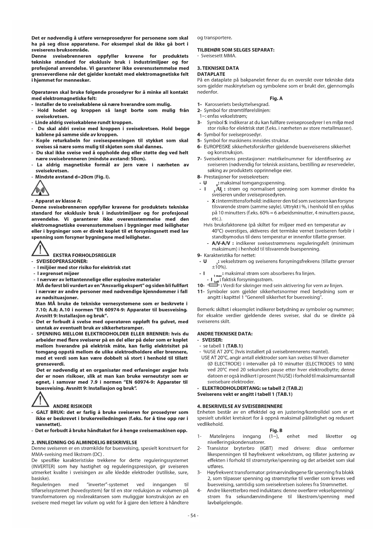 angitt i kapittel 1 “Generell sikkerhet for buesveising”. Bemerk: skiltet i eksemplet indikerer betydning av symboler og nummer; for eksakte verdier gjeldende deres sveiser, skal du se direkte på sveiserens skilt. ANDRE TEKNISKE DATA: - SVEISER: - se tabell 1 (TAB.1) - %USE AT 20°C (hvis installert på sveisebrennerens mantel). USE AT 20°C, angir antall elektroder som kan sveises til hver diameter (Ø ELECTRODE) i intervaller på 10 minutter (ELECTRODES 10 MIN) ved 20°C med 20 sekunders pause etter hver elektrodbytte; denne datoen er også indikert i prosent (%USE) i forhold til maksimumsantall sveisebare elektroder. - ELEKTRODHOLDERTANG: se tabell 2 (TAB.2) Sveiserens vekt er angitt i tabell 1 (TAB.1)