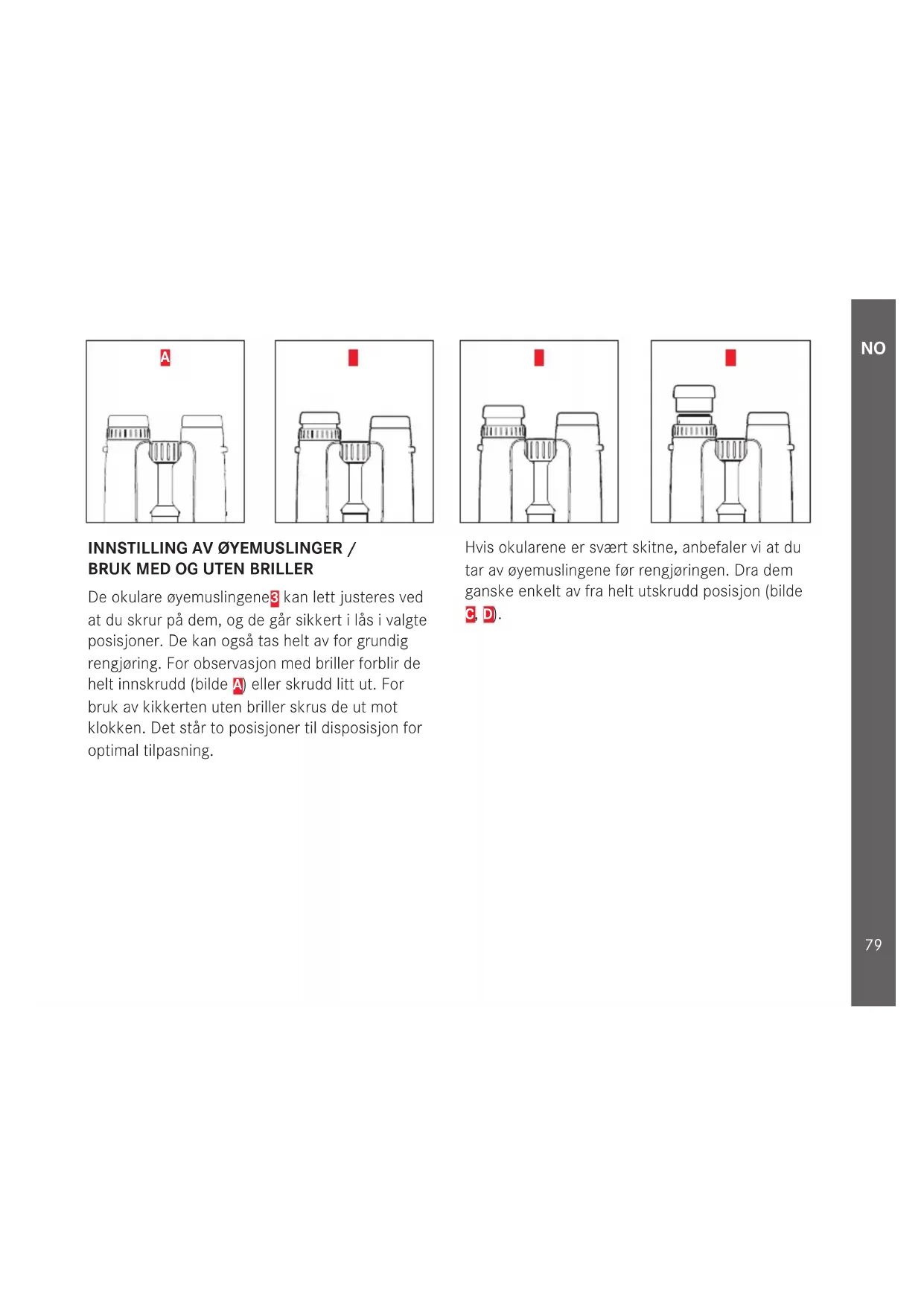 De okulare øyemuslingene 3 kan lett justeres ved at du skrur på dem, og de går sikkert i lås i valgte posisjoner. De kan også tas helt av for grundig rengjøring. For observasjon med briller forblir de helt innskrudd (bilde A) eller skrudd litt ut. For bruk av kikkerten uten briller skrus de ut mot klokken. Det står to posisjoner til disposisjon for optimal tilpasning. Hvis okularene er svært skitne, anbefaler vi at du tar av øyemuslingene før rengjøringen. Dra dem ganske enkelt av fra helt utskrudd posisjon (bilde C, D).