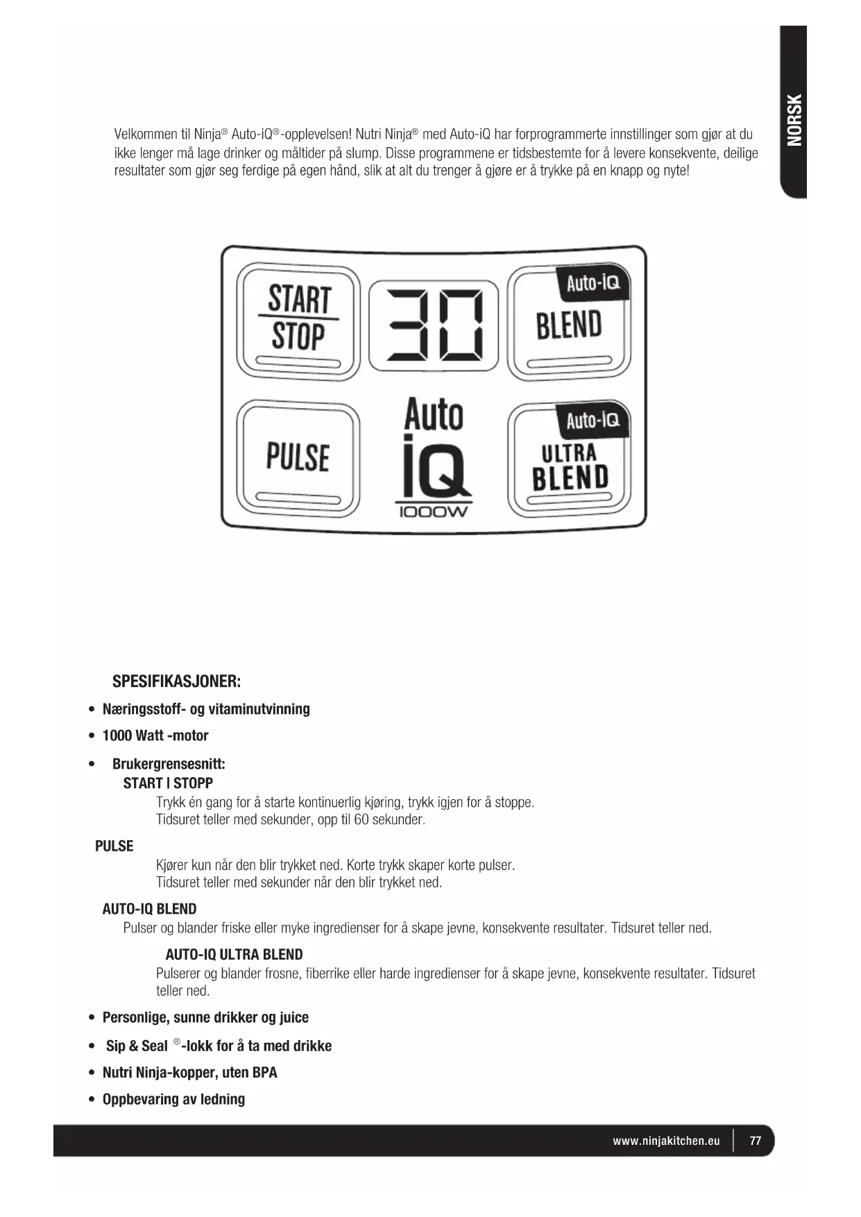 - Brukergrensesnitt: START | STOPP Trykk én gang for å starte kontinuerlig kjøring, trykk igjen for å stoppe. Tidsuret teller med sekunder, opp til 60 sekunder. PULSE Kjører kun når den blir trykket ned. Korte trykk skaper korte pulser. Tidsuret teller med sekunder når den blir trykket ned. AUTO-IQ BLEND Pulser og blander friske eller myke ingredienser for å skape jevne, konsekvente resultater. Tidsuret teller ned.