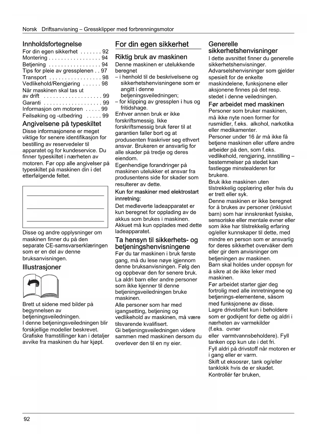 finner typeskiltet i nærheten av motoren. Før opp alle angivelser på typeskiltet på maskinen din i det etterfølgende feltet. Disse og andre opplysninger om maskinen finner du på den separate CE-samsvarserklæringen som er en del av denne bruksanvisningen. Illustrasjoner Brett ut sidene med bilder på begynnelsen av betjeningsveiledningen. I denne betjeningsveiledningen blir forskjellige modeller beskrevet. Grafiske framstillinger kan i detaljer avvike fra maskinen du har kjøpt. For din egen sikkerhet Riktig bruk av maskinen Denne maskinen er utelukkende beregnet – i henhold til de beskrivelsene og sikkerhetshenvisningene som er angitt i denne betjeningsveiledningen; – for klipping av gressplen i hus og fritidshage. Enhver annen bruk er ikke forskriftsmessig. Ikke forskriftsmessig bruk fører til at garantien faller bort og at produsenten fraskriver seg ethvert ansvar. Brukeren er ansvarlig for alle skader på tredje og deres eiendom. Egenhendige forandringer på maskinen utelukker et ansvar fra produsentens side for skader som resulterer av dette. Kun for maskiner med elektrostart innretning: Det medleverte ladeapparatet er kun beregnet for opplading av de akkus som brukes i maskinen. Akkuet må kun opplades med dette ladeapparatet. Ta hensyn til sikkerhets- og betjeningshenvisningene Før du tar maskinen i bruk første gang, må du lese nøye igjennom denne bruksanvisningen. Følg den og oppbevar den for senere bruk. La aldri barn eller andre personer som ikke kjenner til denne betjeningsveiledningen bruke maskinen. Alle personer som har med igangsetting, betjening og vedlikehold av maskinen, må være tilsvarende kvalifisert. Gi betjeningsveiledningen videre sammen med maskinen dersom du overlever den til en ny eier. Generelle sikkerhetshenvisninger I dette avsnittet finner du generelle sikkerhetshenvisninger. Advarselshenvisninger som gjelder spesielt for de enkelte maskindelene, funksjonene eller aksjonene finnes på det resp. stedet i denne veiledningen. Før arbeidet med maskinen Personer som bruker maskinen, må ikke nyte noen former for rusmidler, f.eks. alkohol, narkotika eller medikamenter. Personer under 16 år må ikke få betjene maskinen eller utføre andre arbeider på den, som f.eks. vedlikehold, rengjøring, innstilling – bestemmelser på stedet kan fastlegge minstealderen for brukere. Bruk ikke maskinen uten tilstrekkelig opplæring eller hvis du er trett eller syk. Denne maskinen er ikke beregnet for å brukes av personer (inklusivt barn) som har innskrenket fysiske, sensoriske eller mentale evner eller som ikke har tilstrekkelig erfaring og/eller kunnskaper til dette, med mindre en person som er ansvarlig for deres sikkerhet overvåker dem eller gir dem anvisninger om betjeningen av maskinen. Barn skal holdes under oppsyn for å sikre at de ikke leker med maskinen. Før arbeidet starter gjør deg fortrolig med alle innretningene og betjenings-elementene, såsom med funksjonene av disse. Lagre drivstoffet kun i beholdere som er godkjent for dette og aldri i nærheten av varmekilder (f.eks. ovner eller varmtvannsbeholdere). Fyll tanken opp kun ute i det fri. Fyll aldri på drivstoff når motoren er i gang eller er varm. Skift ut eksosrør, tank og/eller tanklokk hvis de er skadet. Kontrollér før bruken,Driftsanvisning – Gressklipper med forbrenningsmotor Norsk