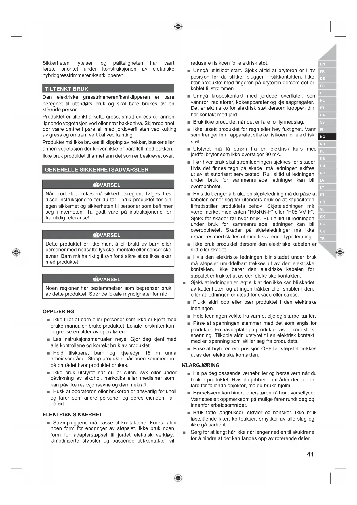 Sikkerheten, ytelsen og påliteligheten har vært første prioritet under konstruksjonen av elektriske hybridgresstrimmeren/kantklipperen. TILTENKT BRUK Den elektriske gresstrimmeren/kantklipperen er bare beregnet til utendørs bruk og skal bare brukes av en stående person. Produktet er tiltenkt å kutte gress, smått ugress og annen lignende vegetasjon ved eller nær bakkenivå. Skjæreplanet bør være omtrent parallell med jordoverfl aten ved kutting av gress og omtrent vertikal ved kanting. Produktet må ikke brukes til klipping av hekker, busker eller annen vegetasjon der kniven ikke er parallell med bakken. Ikke bruk produktet til annet enn det som er beskrevet over. GENERELLE SIKKERHETSADVARSLER ADVARSEL Når produktet brukes må sikkerhetsreglene følges. Les disse instruksjonene før du tar i bruk produktet for din egen sikkerhet og sikkerheten til personer som befi nner seg i nærheten. Ta godt vare på instruksjonene for framtidig referanse! ADVARSEL Dette produktet er ikke ment å bli brukt av barn eller personer med nedsatte fysiske, mentale eller sensoriske evner. Barn må ha riktig tilsyn for å sikre at de ikke leker med produktet. ADVARSEL Noen regioner har bestemmelser som begrenser bruk av dette produktet. Spør de lokale myndigheter for råd. OPPLÆRING ■ Ikke tillat at barn eller personer som ikke er kjent med brukermanualen bruke produktet. Lokale forskrifter kan begrense en alder av operatøren. ■ Les instruksjonsmanualen nøye. Gjør deg kjent med alle kontrollene og korrekt bruk av produktet. ■ Hold tilskuere, barn og kjæledyr 15 m unna arbeidsområde. Stopp produktet når noen kommer inn på området hvor produktet brukes. ■ Ikke bruk utstyret når du er sliten, syk eller under påvirkning av alkohol, narkotika eller medisiner som kan påvirke reaksjonsevne og dømmekraft. ■ Husk at operatøren eller brukeren er ansvarlig for uhell og farer som andre personer og deres eiendom får påført. ELEKTRISK SIKKERHET ■ Strømpluggene må passe til kontaktene. Foreta aldri noen form for endringer av støpslet. Ikke bruk noen form for adapterstøpsel til jordet elektrisk verktøy. Umodifiserte støpsler og passende stikkontakter vil redusere risikoen for elektrisk støt. ■ Unngå utilsiktet start. Sjekk alltid at bryteren er i av- posisjon før du stikker pluggen i stikkontakten. Ikke bær produktet med fingeren på bryteren dersom det er koblet til strømmen. ■ Unngå kroppskontakt med jordede overflater, som vannrør, radiatorer, kokeapparater og kjøleaggregater. Det er økt risiko for elektrisk støt dersom kroppen din har kontakt med jord. ■ Bruk ikke produktet når det er fare for lynnedslag. ■ Ikke utsett produktet for regn eller høy fuktighet. Vann som trenger inn i apparatet vil øke risikoen for elektrisk støt. ■ Utstyret må få strøm fra en elektrisk kurs med jordfeilbryter som ikke overstiger 30 mA. ■ Før hver bruk skal strømledningen sjekkes for skader. Hvis det finnes tegn på skade, må ledningen skiftes ut av et autorisert servicested. Rull alltid ut ledningen under bruk for sammenrullede ledninger kan bli overopphetet. ■ Hvis du trenger å bruke en skjøteledning må du påse at kabelen egner seg for utendørs bruk og at kapasiteten tilfredsstiller produktets behov. Skjøteledningen må være merket med enten "H05RN-F" eller "H05 VV F". Sjekk for skader før hver bruk. Rull alltid ut ledningen under bruk for sammenrullede ledninger kan bli overopphetet. Skader på skjøteledninger må ikke repareres med skiftes ut med tilsvarende type ledning. ■ Ikke bruk produktet dersom den elektriske kabelen er slitt eller skadet. ■ Hvis den elektriske ledningen blir skadet under bruk må støpslet umiddelbart trekkes ut av den elektriske kontakten. Ikke berør den elektriske kabelen før støpslet er trukket ut av den elektriske kontakten. ■ Sjekk at ledningen er lagt slik at den ikke kan bli skadet av kuttenheten og at ingen tråkker eller snubler i den, eller at ledningen er utsatt for skade eller stress. ■ Plukk aldri opp eller bær produktet i den elektriske ledningen. ■ Hold ledningen vekke fra varme, olje og skarpe kanter. ■ Påse at spenningen stemmer med det som angis for produktet. En navneplate på produktet viser produktets spenning. Tilkoble aldri utstyret til en elektrisk kontakt med en spenning som skiller seg fra produktets. ■ Påse at bryteren er i posisjon OFF før støpslet trekkes ut av den elektriske kontakten. KLARGJØRING ■ Ha på deg passende vernebriller og hørselvern når du bruker produktet. Hvis du jobber i områder der det er fare for fallende objekter, må du bruke hjelm. ■ Hørselsvern kan hindre operatøren i å høre varsellyder. Vær spesielt oppmerksom på mulige farer rundt deg og innenfor arbeidsområdet. ■ Bruk tette langbukser, støvler og hansker. Ikke bruk løstsittende klær, kortbukser, smykker av alle slag og ikke gå barbent. ■ Sørg for at langt hår ikke når lenger ned en til skuldrene for å hindre at det kan fanges opp av roterende deler.42 | Norsk ■ Før bruk og etter hvert slag, sjekk for skadede deler. En defekt bryter eller annen del som er skadet eller slitt skal repareres adekvat eller skiftes ut av et autorisert serviceverksted. ■ Påse at kutteutstyret er satt på riktig og festet godt. ■ Ikke bruk produktet dersom ikke alle vern, avvisere og håndtak er på plass og forsvarlig festet. ■ Vurder omgivelsene du skal jobbe i. Hold arbeidsområde fri for ledninger, pinner, steiner og annet avfall som kan sprette unna dersom kutteren kommer borti det.