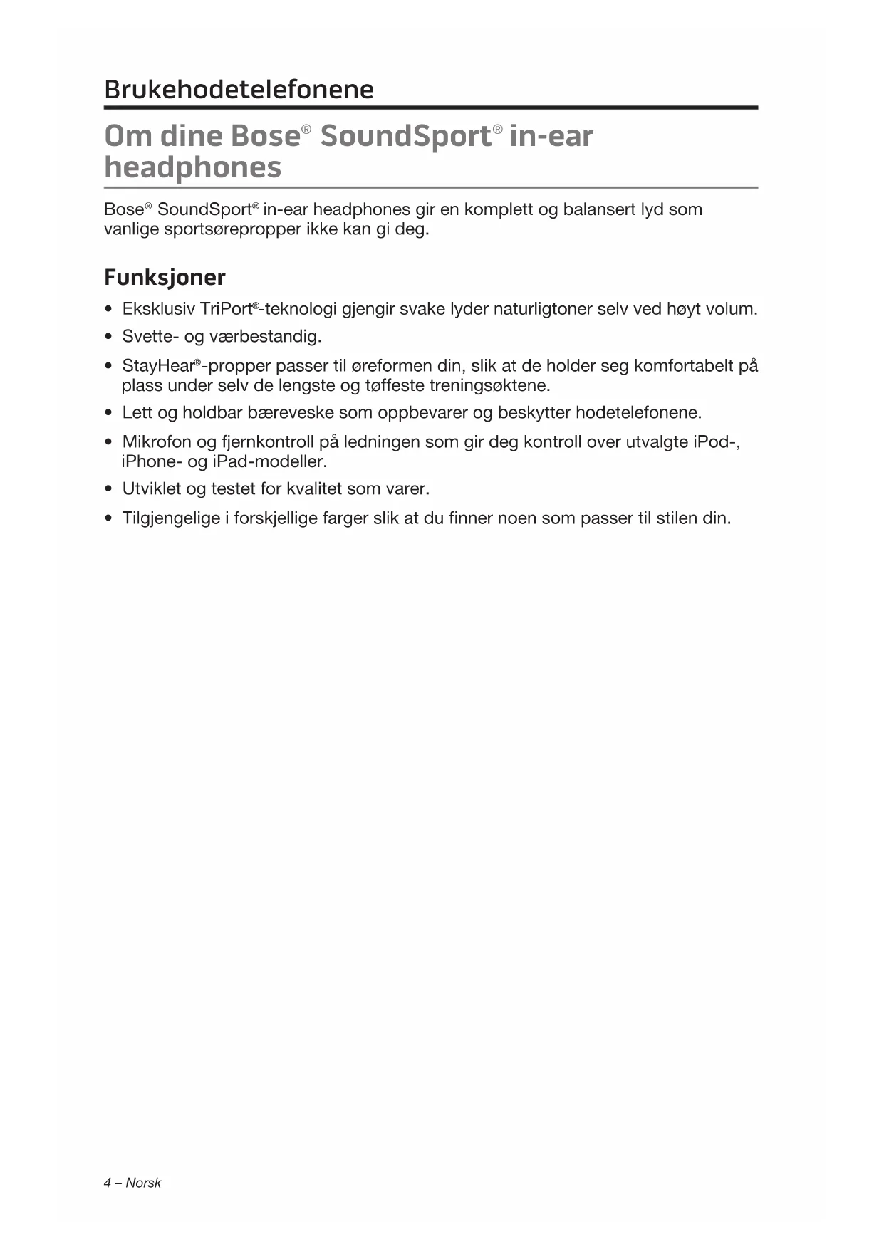 Apple er ikke ansvarlig for hvordan enheten fungerer eller hvordan den overholder sikkerhetsbestemmelser og andre standarder . Vær oppmerksom på at bruk av tilbehøret med iPod, iPhone eller iPad kan påvirke ytelsen til den trådløse tilkoplingen.Bruke hodetelefonene 4 – Norsk Om dine Bose